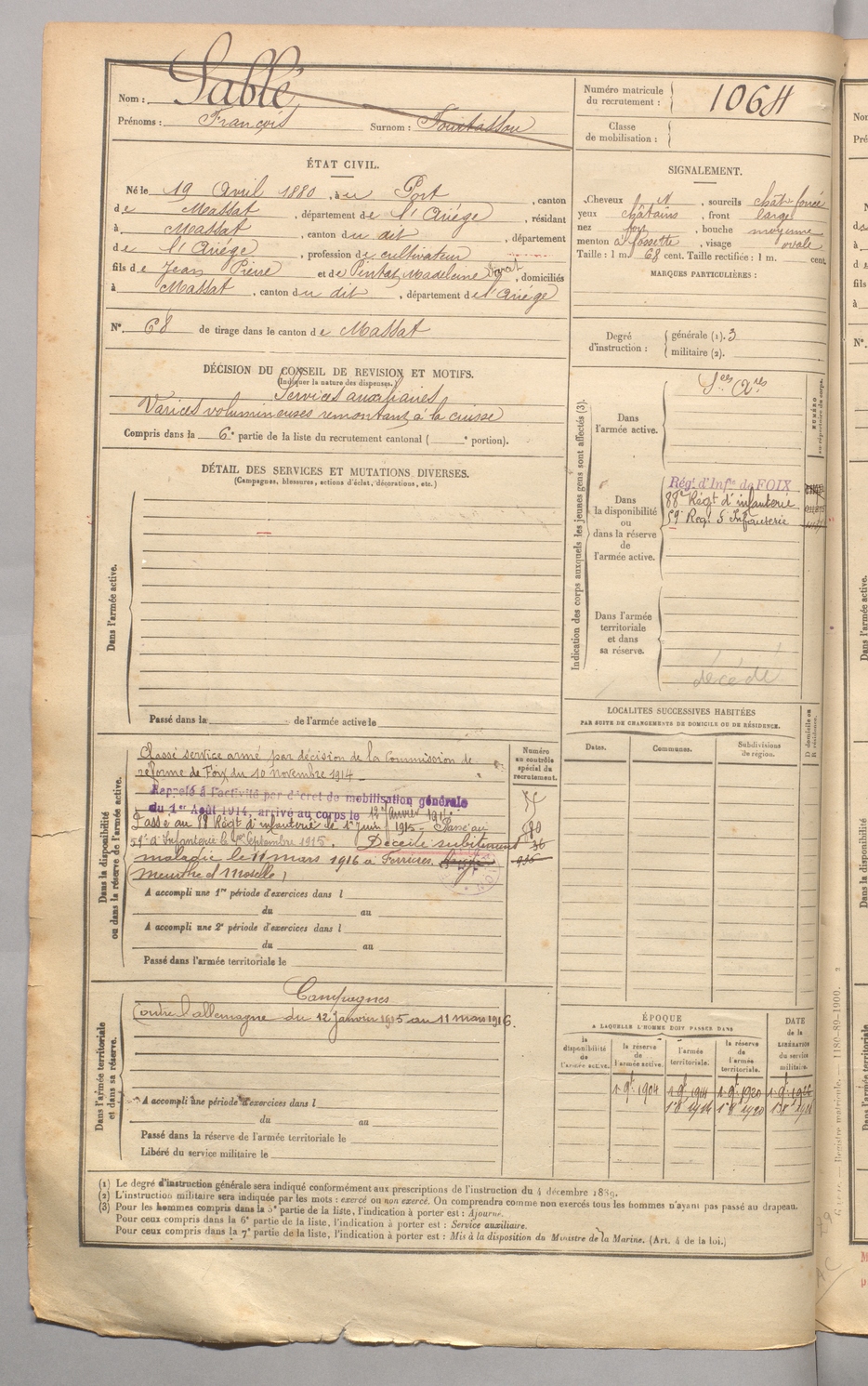 | Sablé | François dit Fourtassou | FOIX | 129 W 4 | 1900 | Port (Le) | Massat | 1064 |