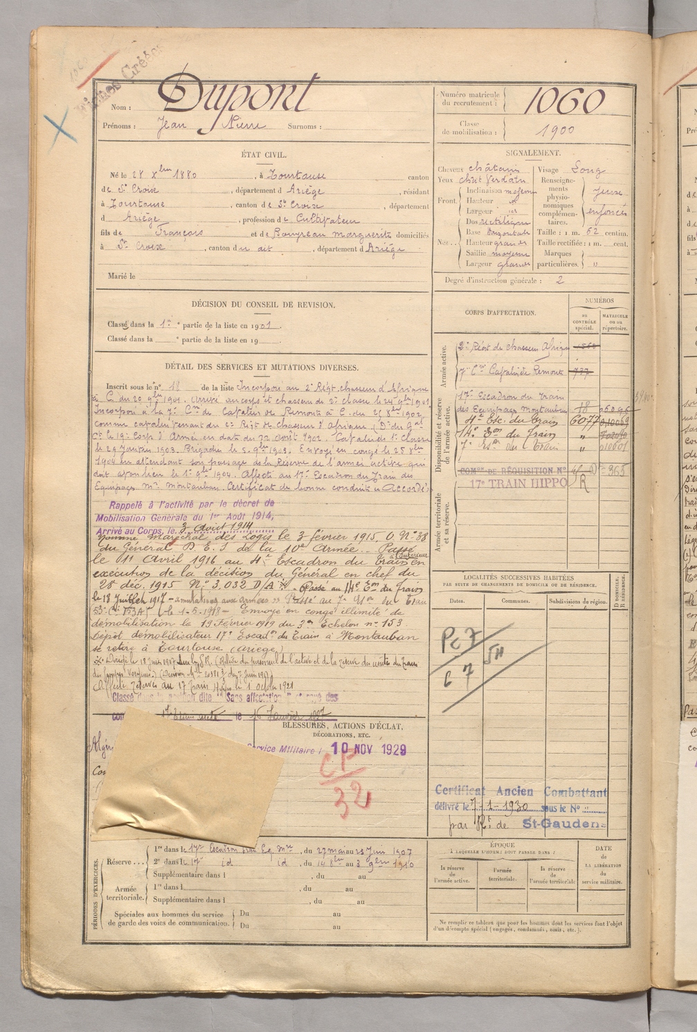 | Dupont | Jean Pierre | FOIX | 129 W 5 | 1900 | Tourtouse | Tourtouse | 1060 |