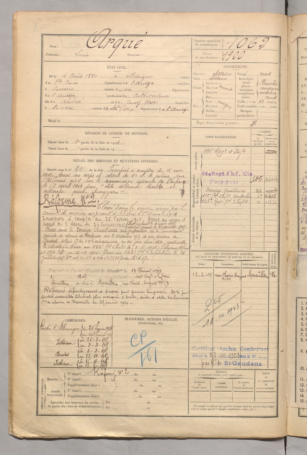 | Arqué | Louis | FOIX | 129 W 5 | 1900 | Mérigon | Lasserre | 1062 |