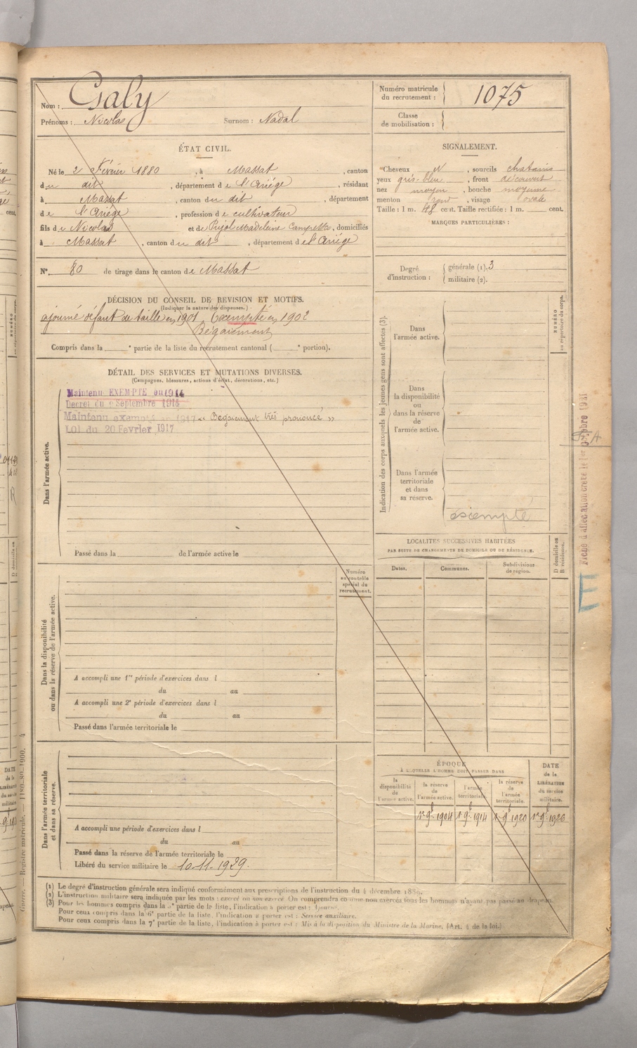 | Galy | Nicolas dit Nadal | FOIX | 129 W 4 | 1900 | Massat | Massat | 1075 |