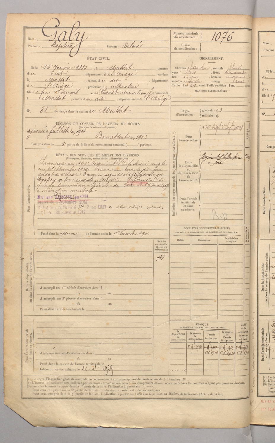 | Galy | Baptiste dit Baloué | FOIX | 129 W 4 | 1900 | Massat | Massat | 1076 |