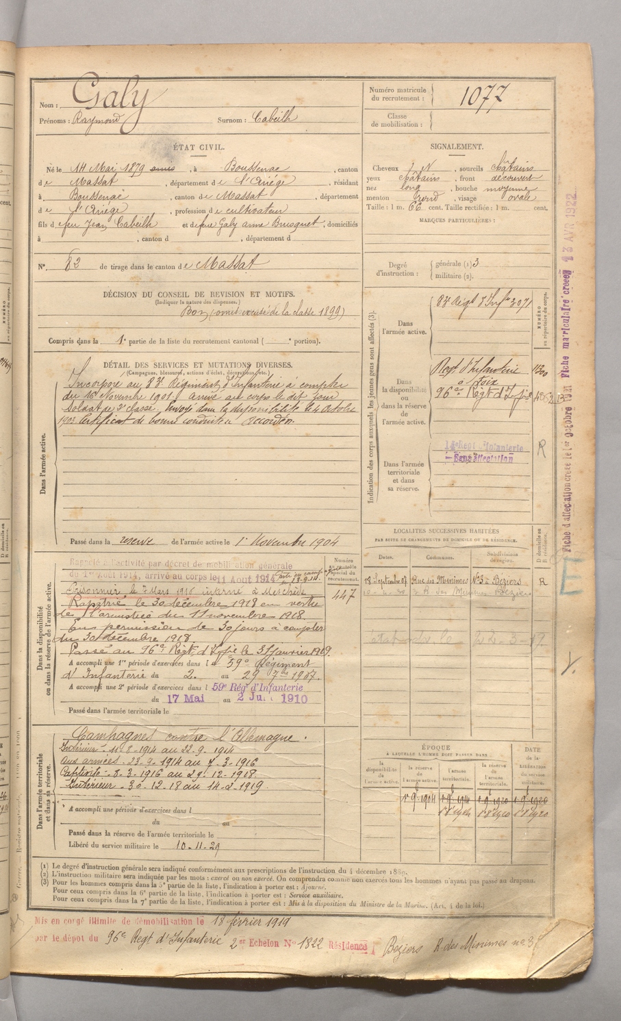 | Galy | Raymond dit Cabeilh | FOIX | 129 W 4 | 1900 | Boussenac | Boussenac | 1077 |