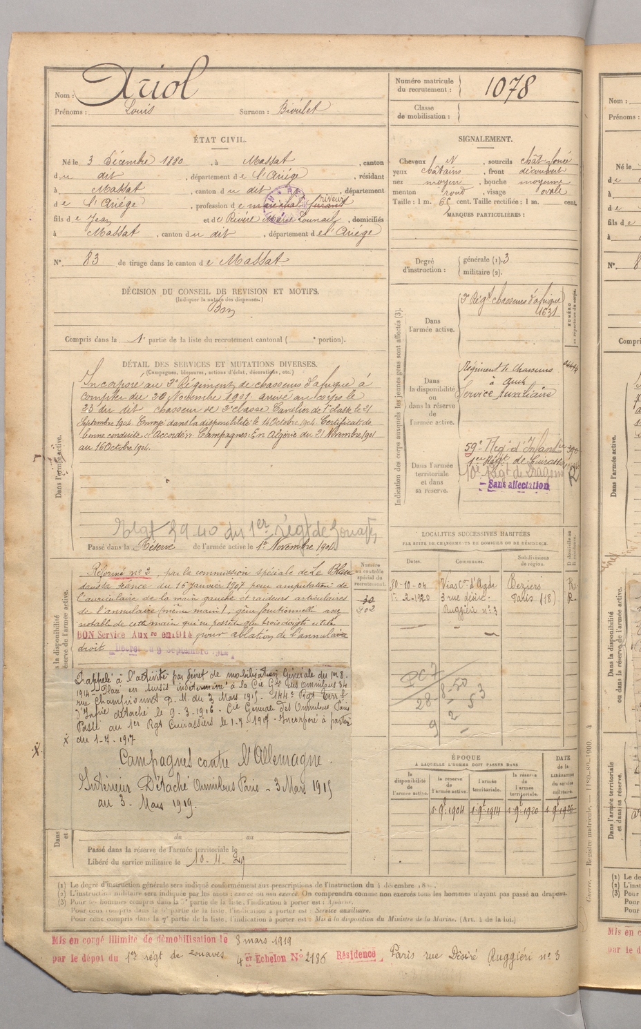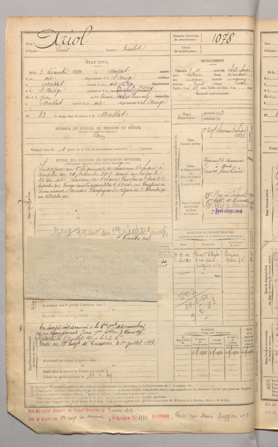 | Ariol | Louis dit Bioulet | FOIX | 129 W 4 | 1900 | Massat | Massat | 1078 |