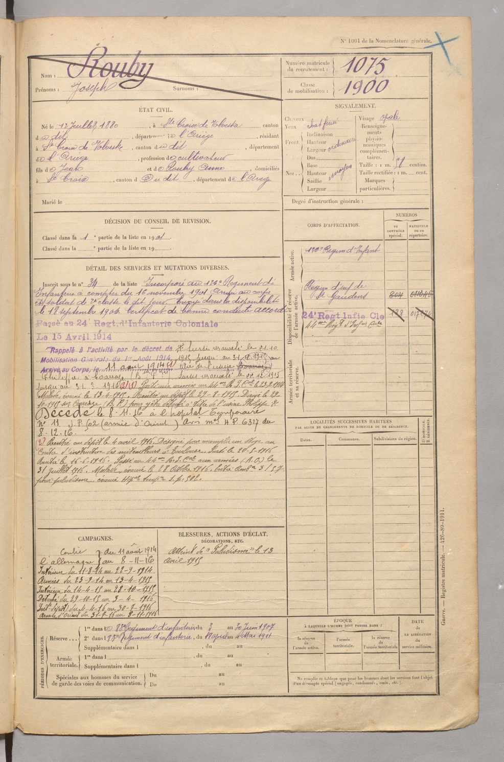 | Rouby | Joseph | FOIX | 129 W 5 | 1900 | Sainte-Croix-Volvestre | Sainte-Croix-Volvestre | 1075 |
