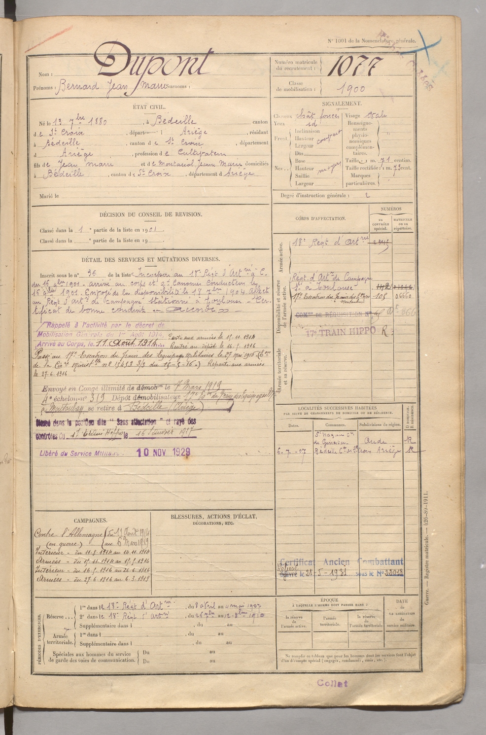 | Dupont | Bernard Jean Marie | FOIX | 129 W 5 | 1900 | Bédeille | Bédeille | 1077 |