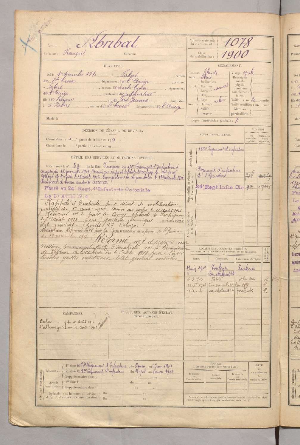 | Abribat | François | FOIX | 129 W 5 | 1900 | Fabas | Fabas | 1078 |