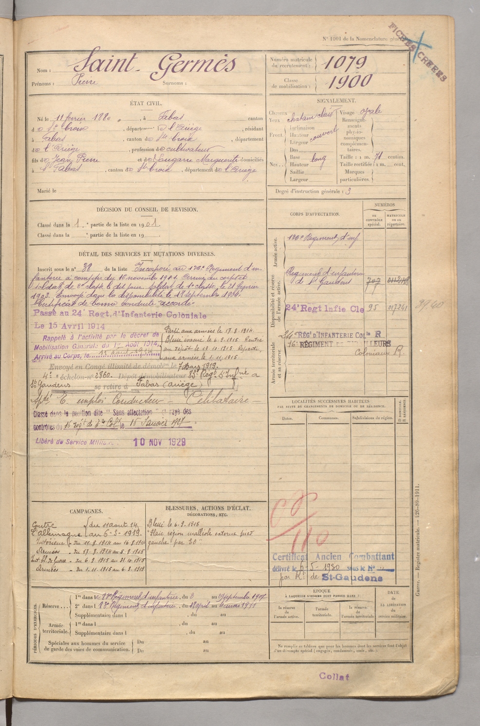 | Saint Germès | Pierre | FOIX | 129 W 5 | 1900 | Fabas | Fabas | 1079 |
