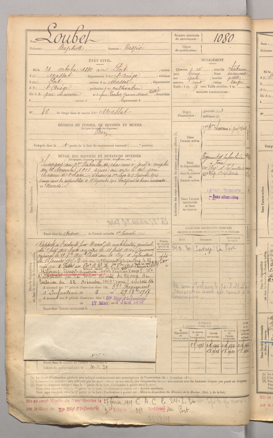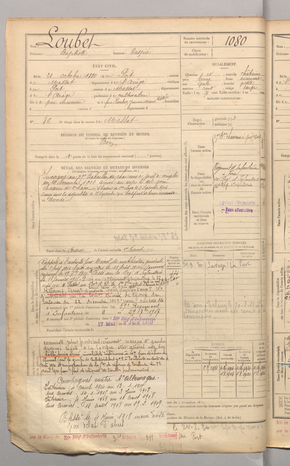 | Loubet | Baptiste dit Raspié | FOIX | 129 W 4 | 1900 | Port (Le) | Port (Le) | 1080 |
