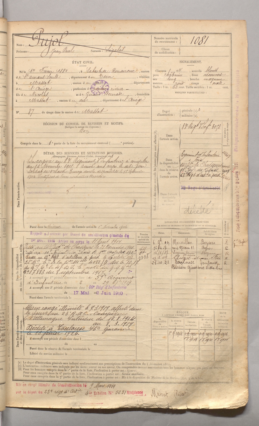 | Pujol | Jean Paul dit Ségalas | FOIX | 129 W 4 | 1900 | Labastide Rouairoux | Massat | 1081 |