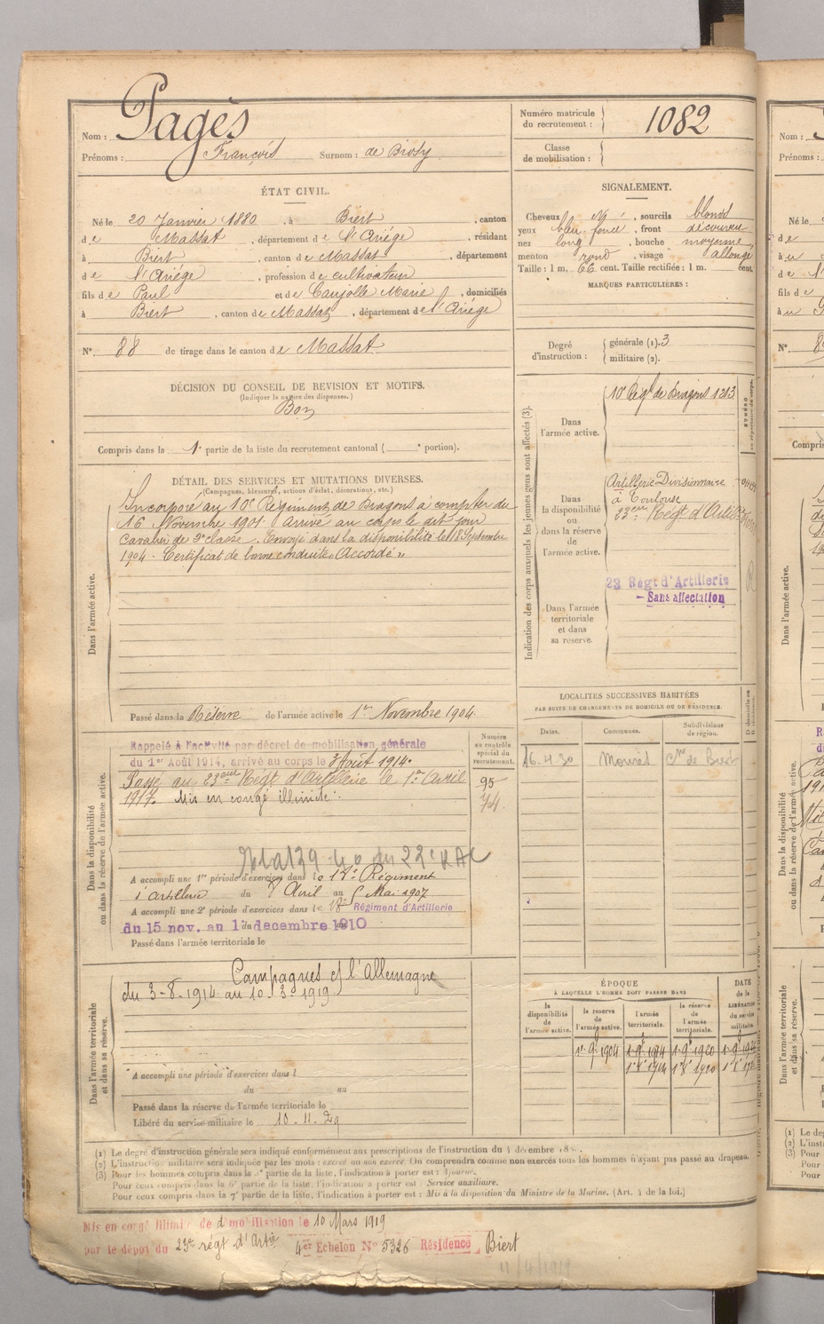 | Pagès | François dit De Biosy | FOIX | 129 W 4 | 1900 | Biert | Biert | 1082 |
