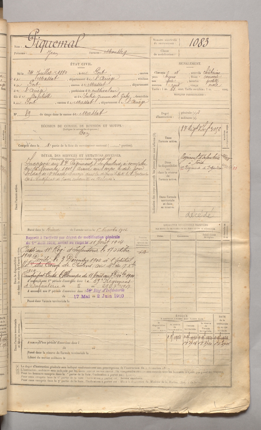 | Piquemal | Jean dit Mousseq | FOIX | 129 W 4 | 1900 | Port (Le) | Port (Le) | 1083 |