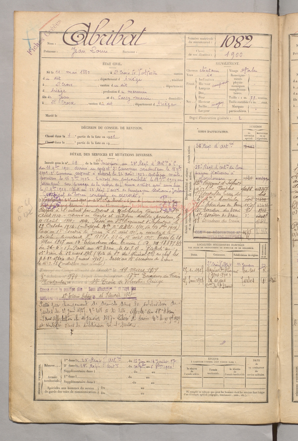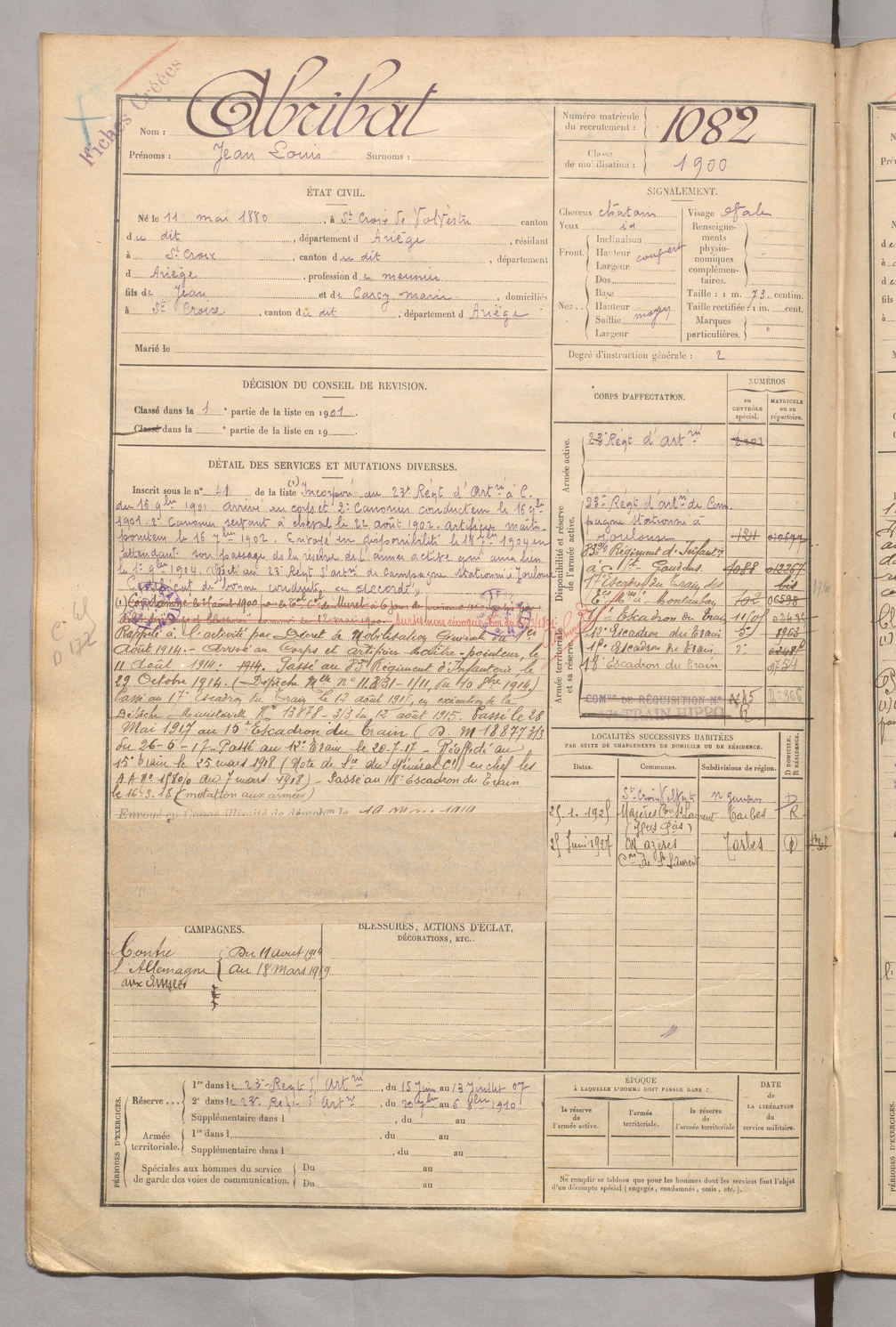 | Abribat | Jean Louis | FOIX | 129 W 5 | 1900 | Sainte-Croix-Volvestre | Sainte-Croix-Volvestre | 1082 |