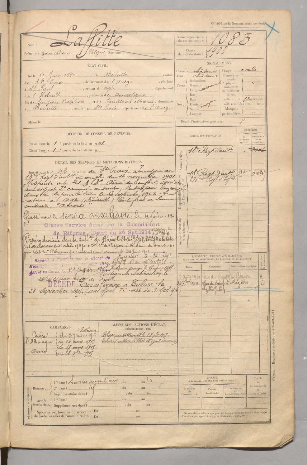 | Laffitte | Jean Marie Ulysse | FOIX | 129 W 5 | 1900 | Bédeille | Saint-Paul | 1083 |