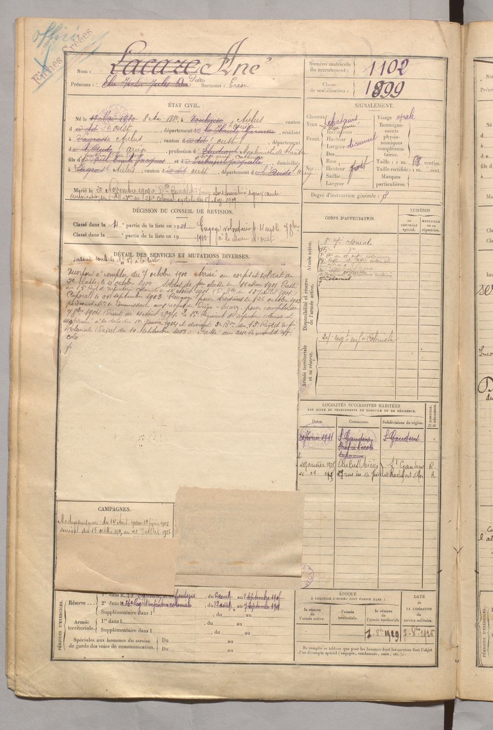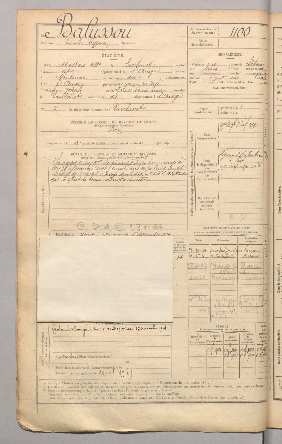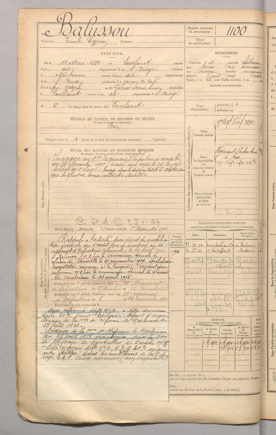 | Balussou | Emile Cyprien | FOIX | 129 W 4 | 1900 | Lavelanet | Narbonne | 1100 |