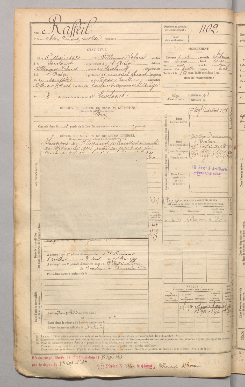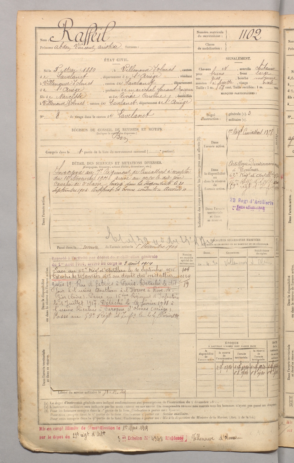 | Raffeil | Abdon Vincent Aristide | FOIX | 129 W 4 | 1900 | Villeneuve-d'Olmes | Villeneuve-d'Olmes | 1102 |