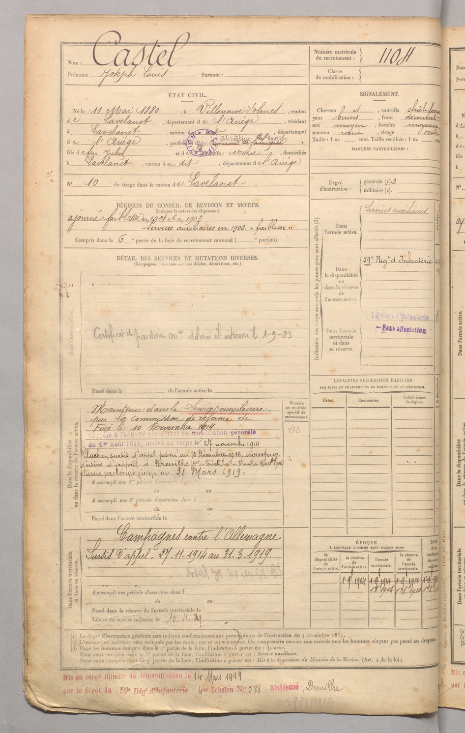 | Castel | Joseph Louis | FOIX | 129 W 4 | 1900 | Villeneuve-d'Olmes | Lavelanet | 1104 |