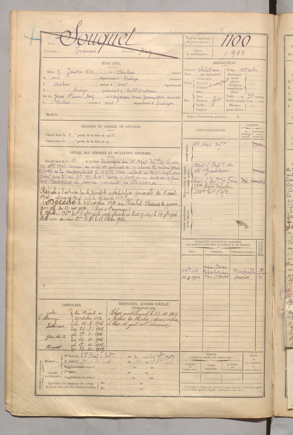 | Souquet | François dit Rey | FOIX | 129 W 5 | 1900 | Aulus-les-Bains | Aulus-les-Bains | 1100 |