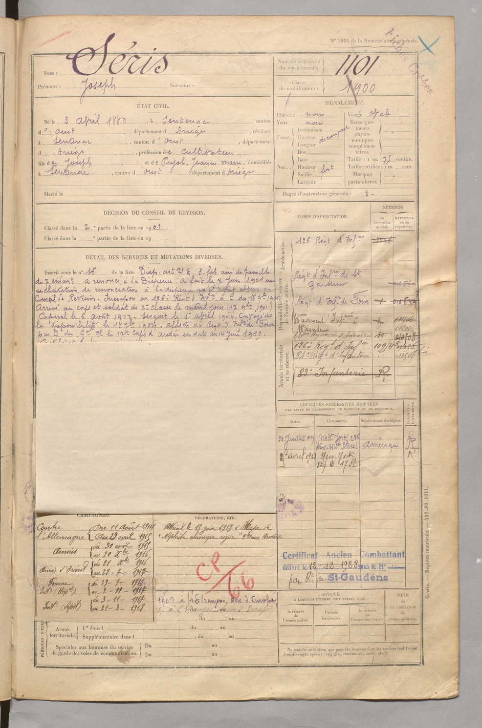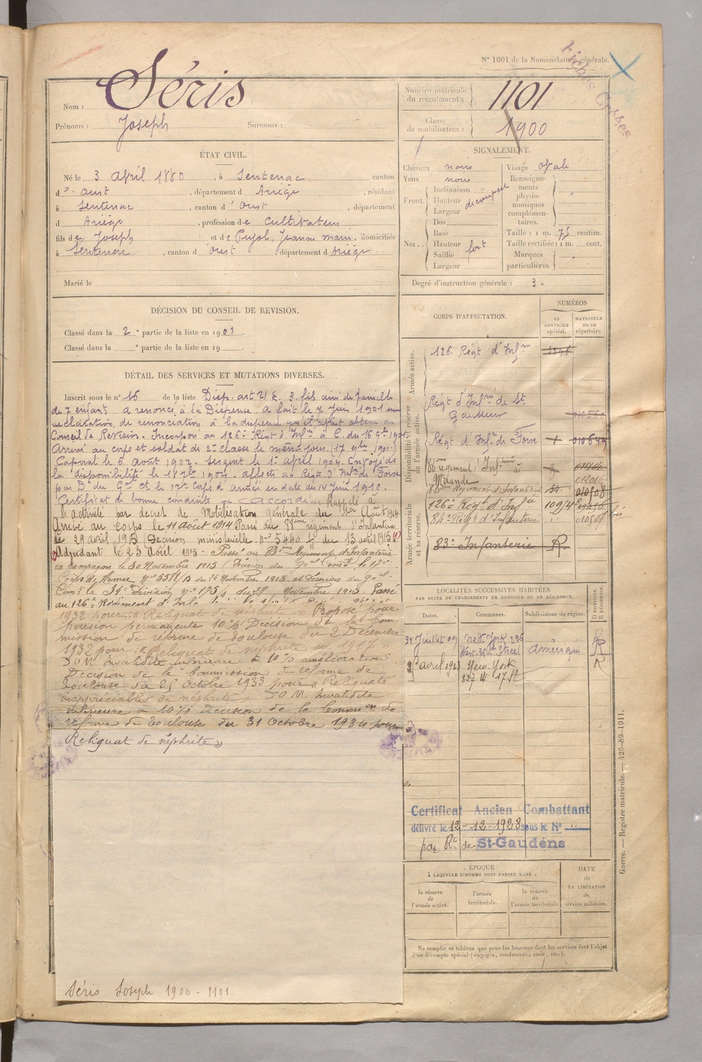 | Séris | Joseph | FOIX | 129 W 5 | 1900 | Sentenac-d'Oust | Sentenac-d'Oust | 1101 |
