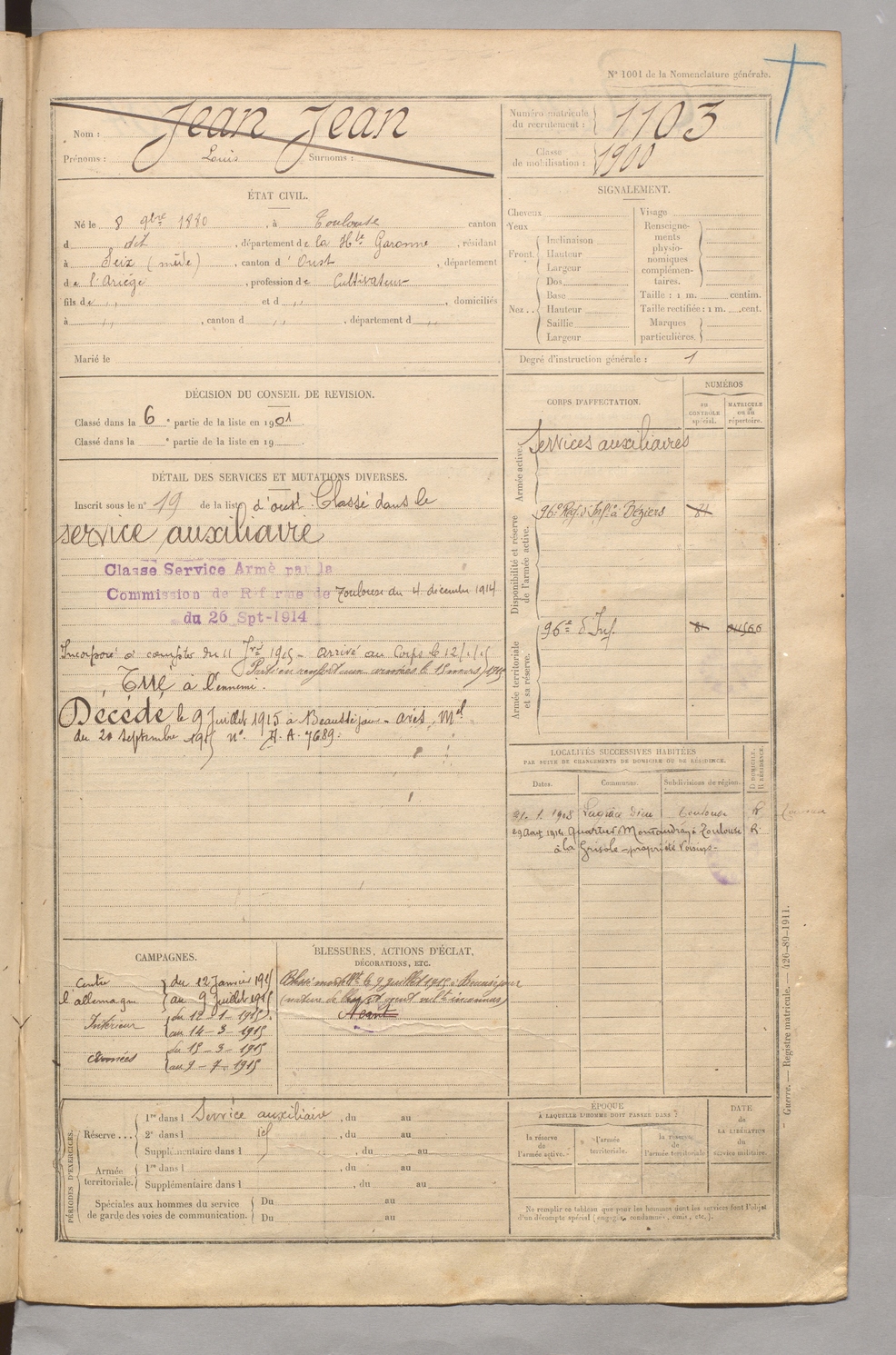 | Jean Jean | Louis | FOIX | 129 W 5 | 1900 | Toulouse | Seix | 1103 |