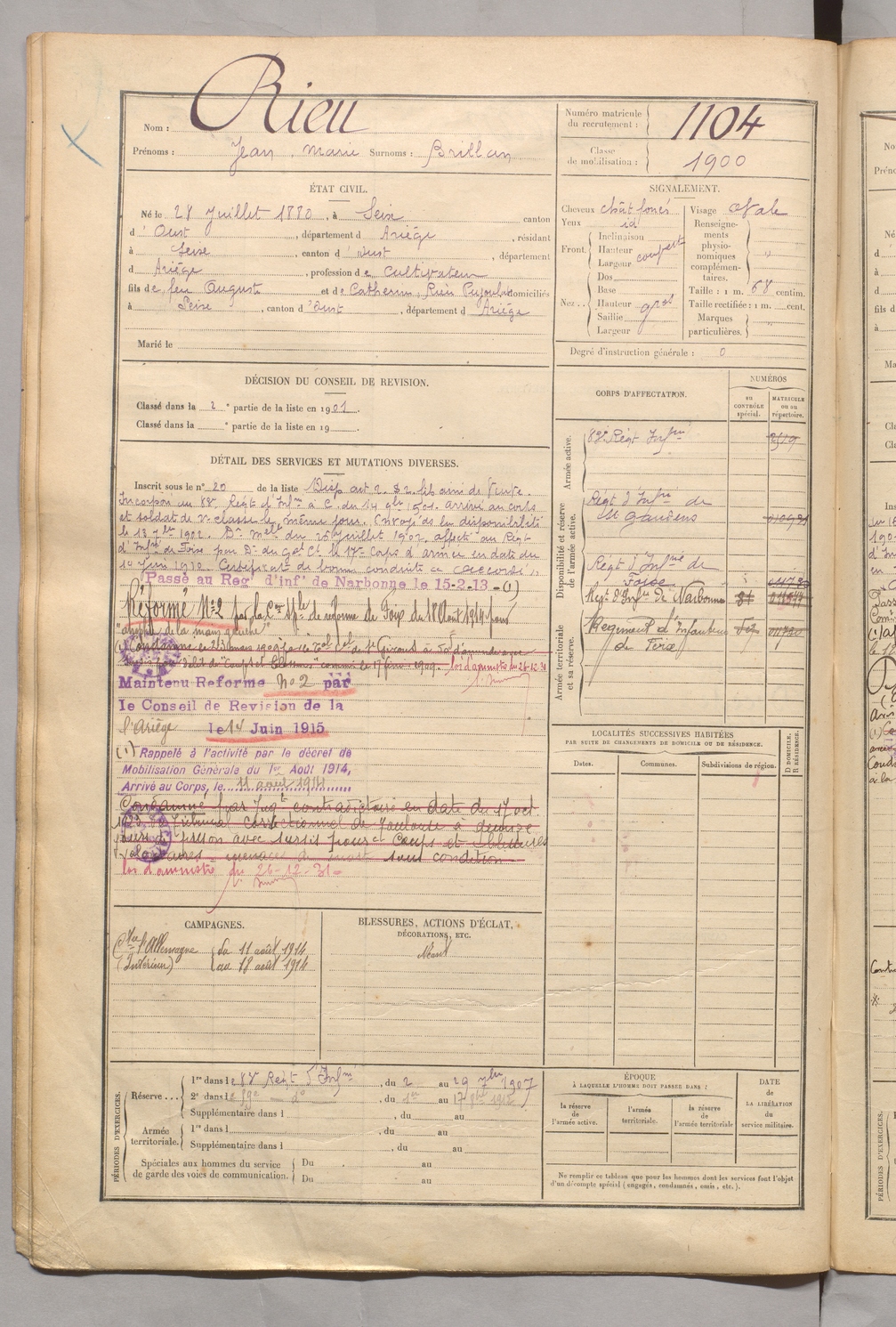 | Rieu | Jean Marie dit Brillan | FOIX | 129 W 5 | 1900 | Seix | Seix | 1104 |