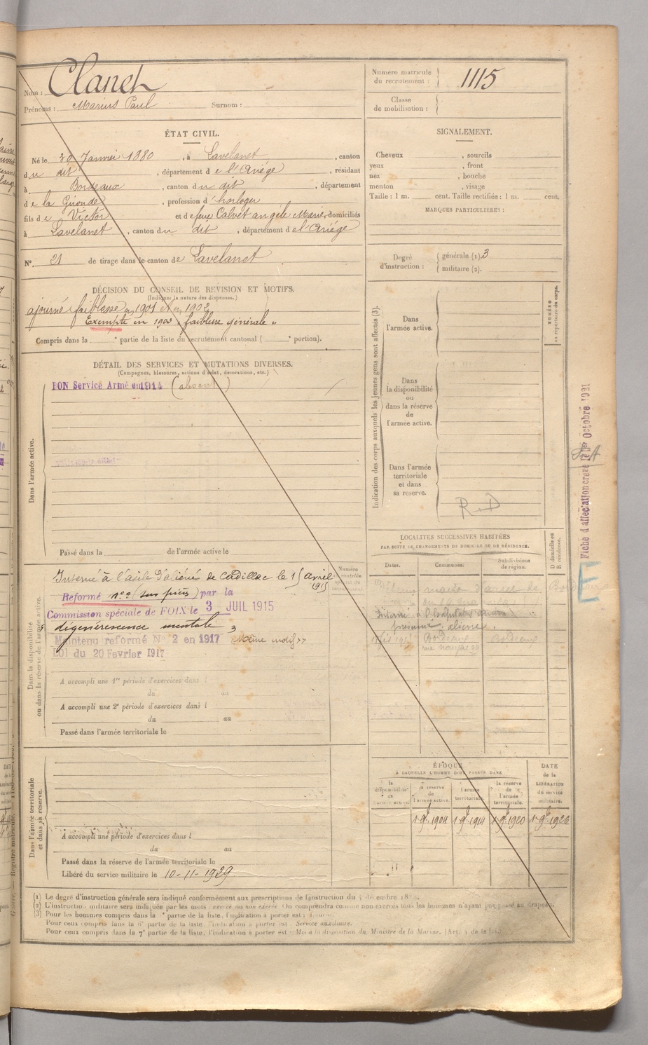 | Clanet | Marius Paul | FOIX | 129 W 4 | 1900 | Lavelanet | Bordeaux | 1115 |