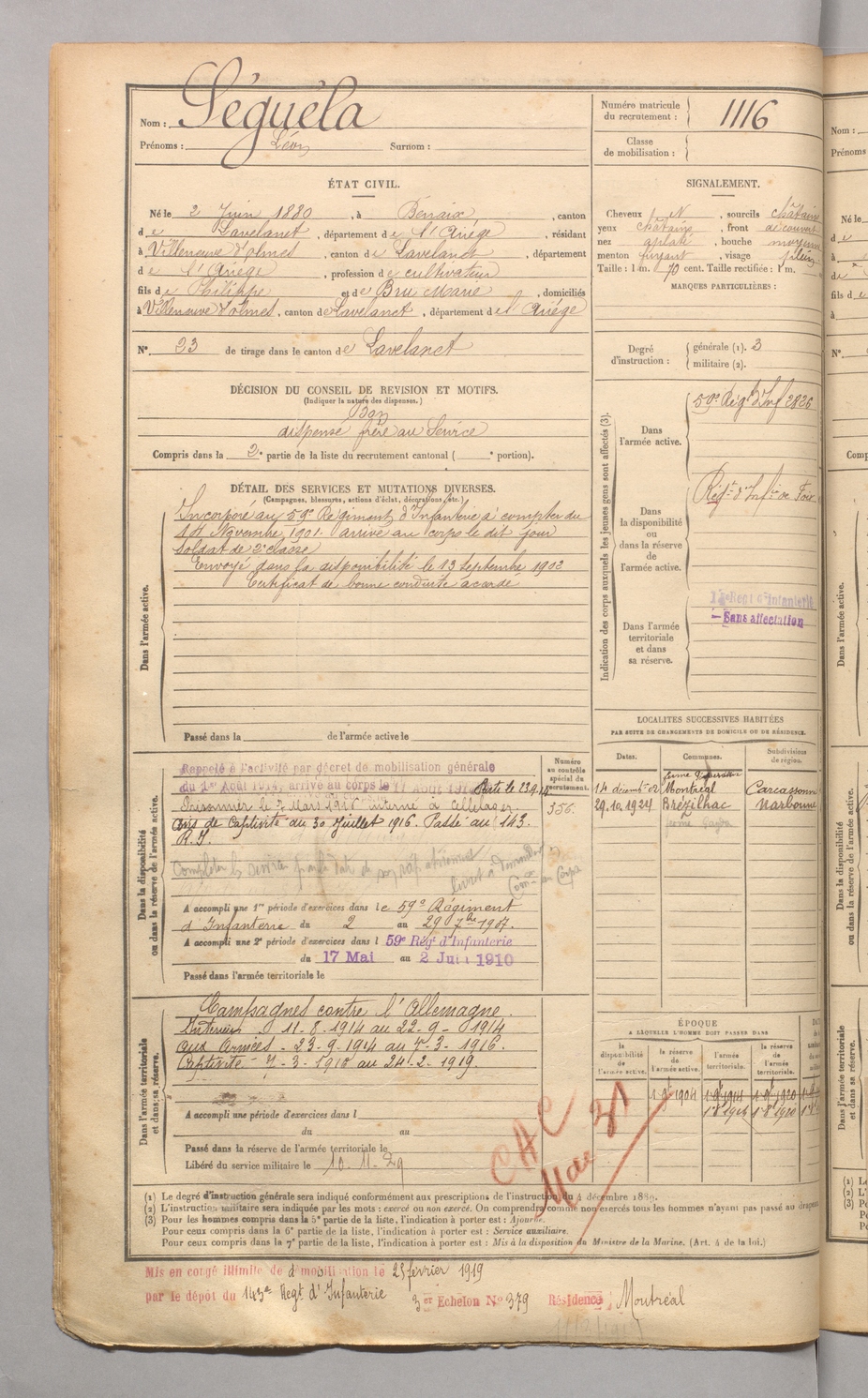 | Séguéla | Léon | FOIX | 129 W 4 | 1900 | Bénaix | Villeneuve-d'Olmes | 1116 |