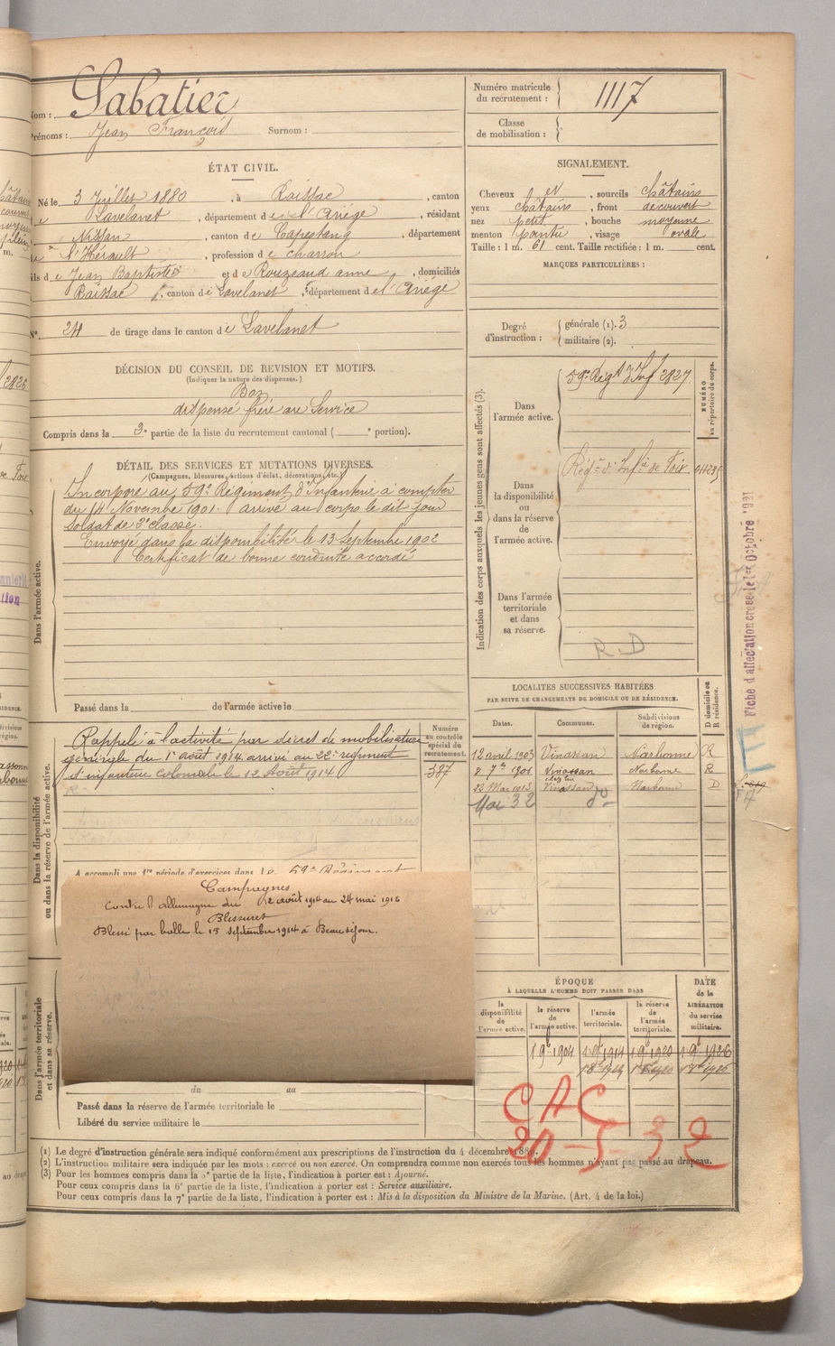 | Sabatier | Jean François | FOIX | 129 W 4 | 1900 | Raissac | Nissan | 1117 |