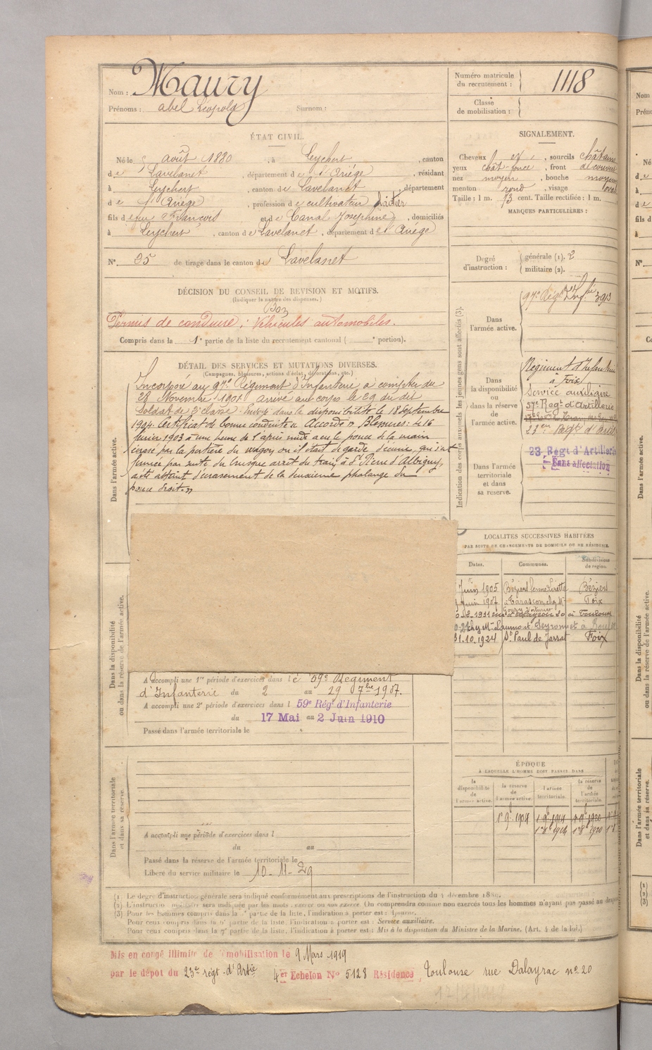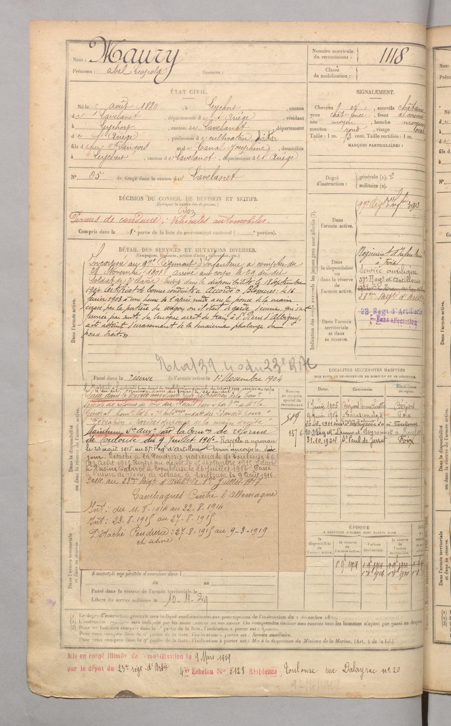 | Maury | Abel Léopold | FOIX | 129 W 4 | 1900 | Leychert | Leychert | 1118 |