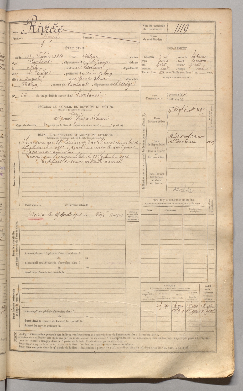 | Rivière | Joseph | FOIX | 129 W 4 | 1900 | Nalzen | Nalzen | 1119 |