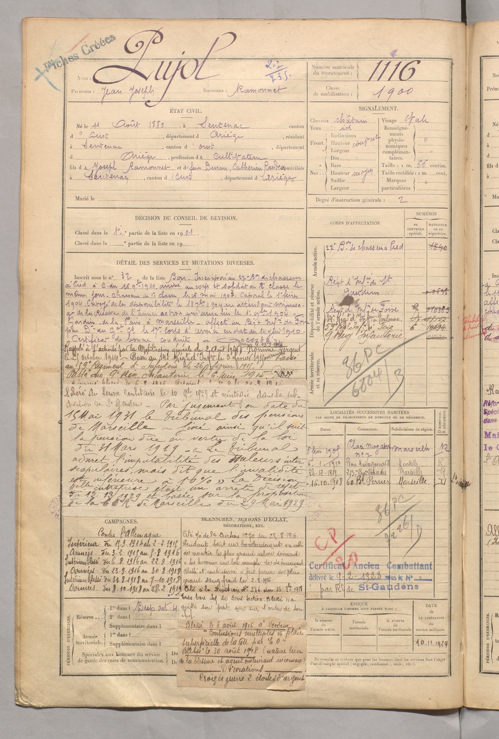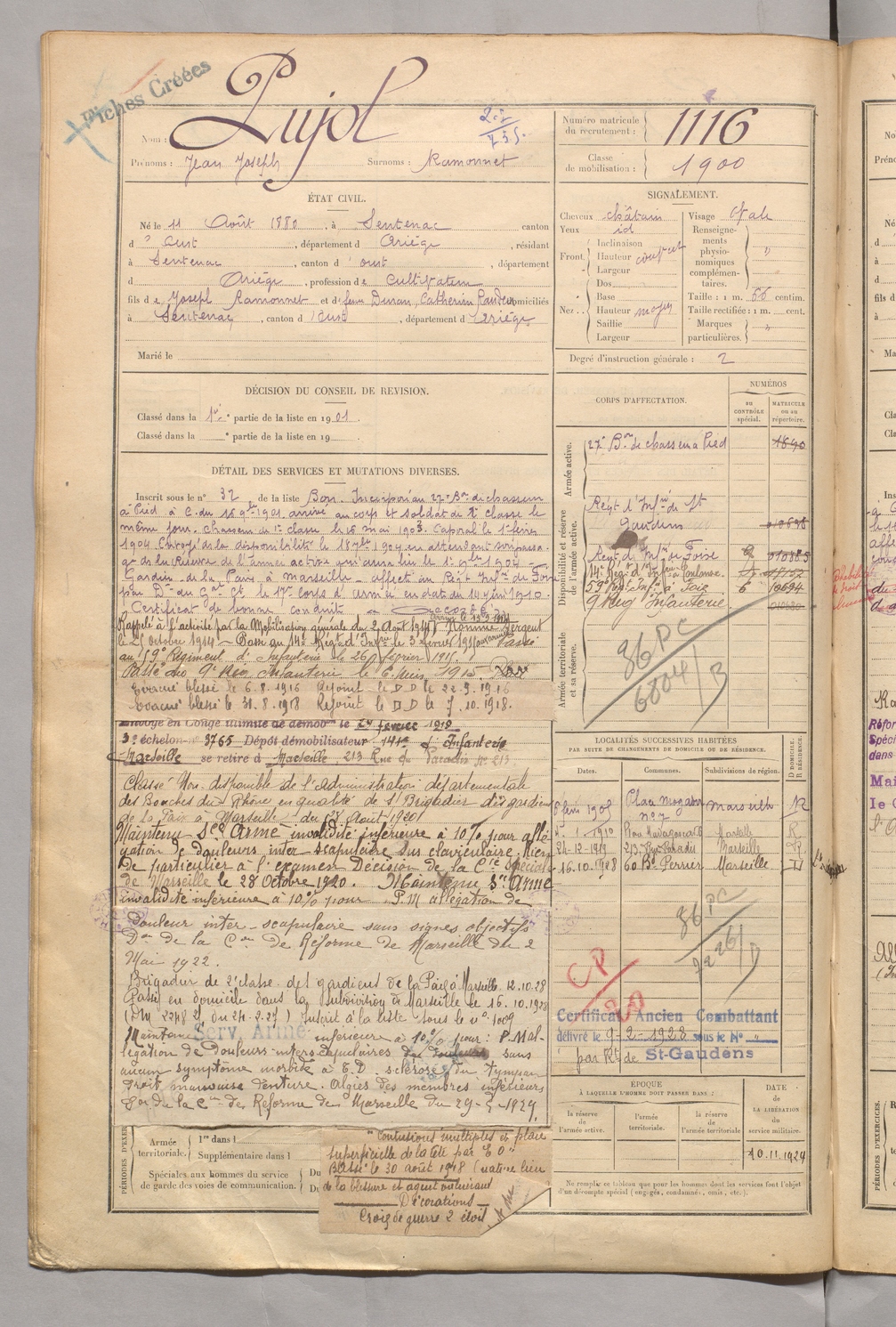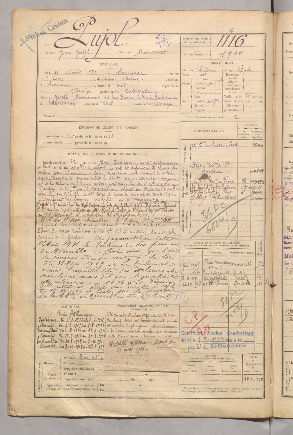 | Pujol | Jean Joseph dit Ramonnet | FOIX | 129 W 5 | 1900 | Sentenac-d'Oust | Sentenac-d'Oust | 1116 |