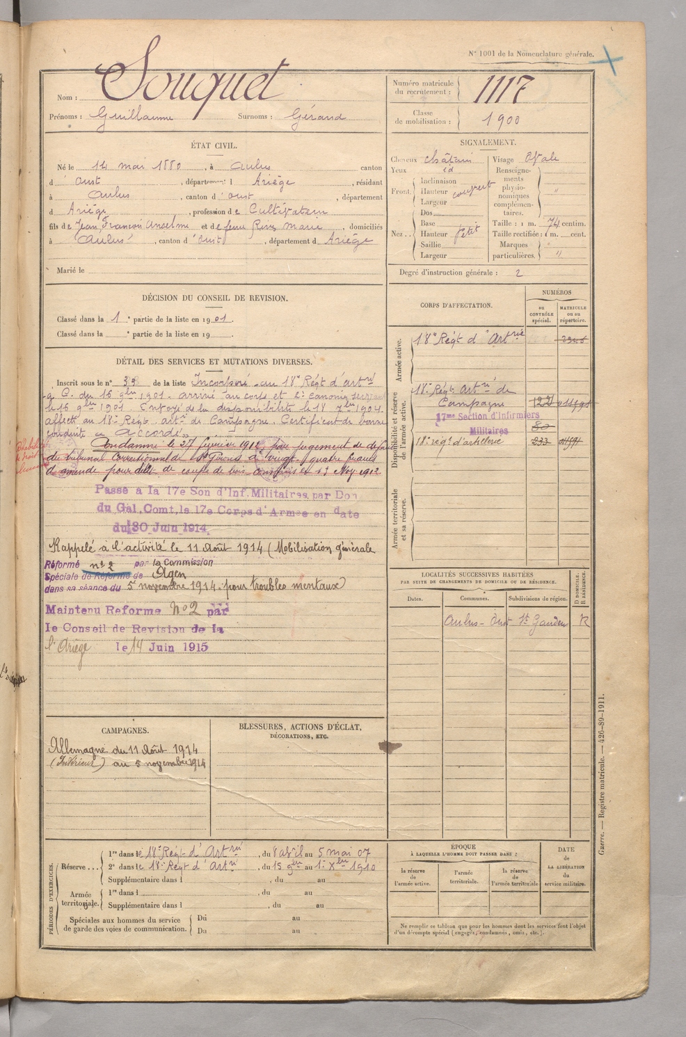 | Souquet | Guillaume dit Gérand | FOIX | 129 W 5 | 1900 | Aulus-les-Bains | Aulus-les-Bains | 1117 |