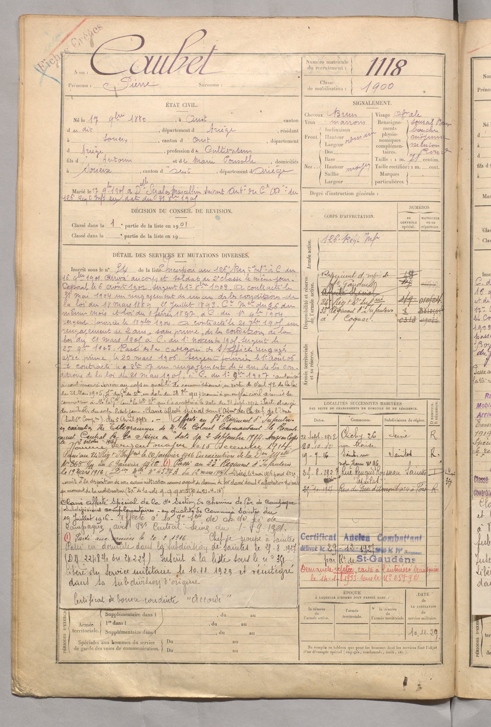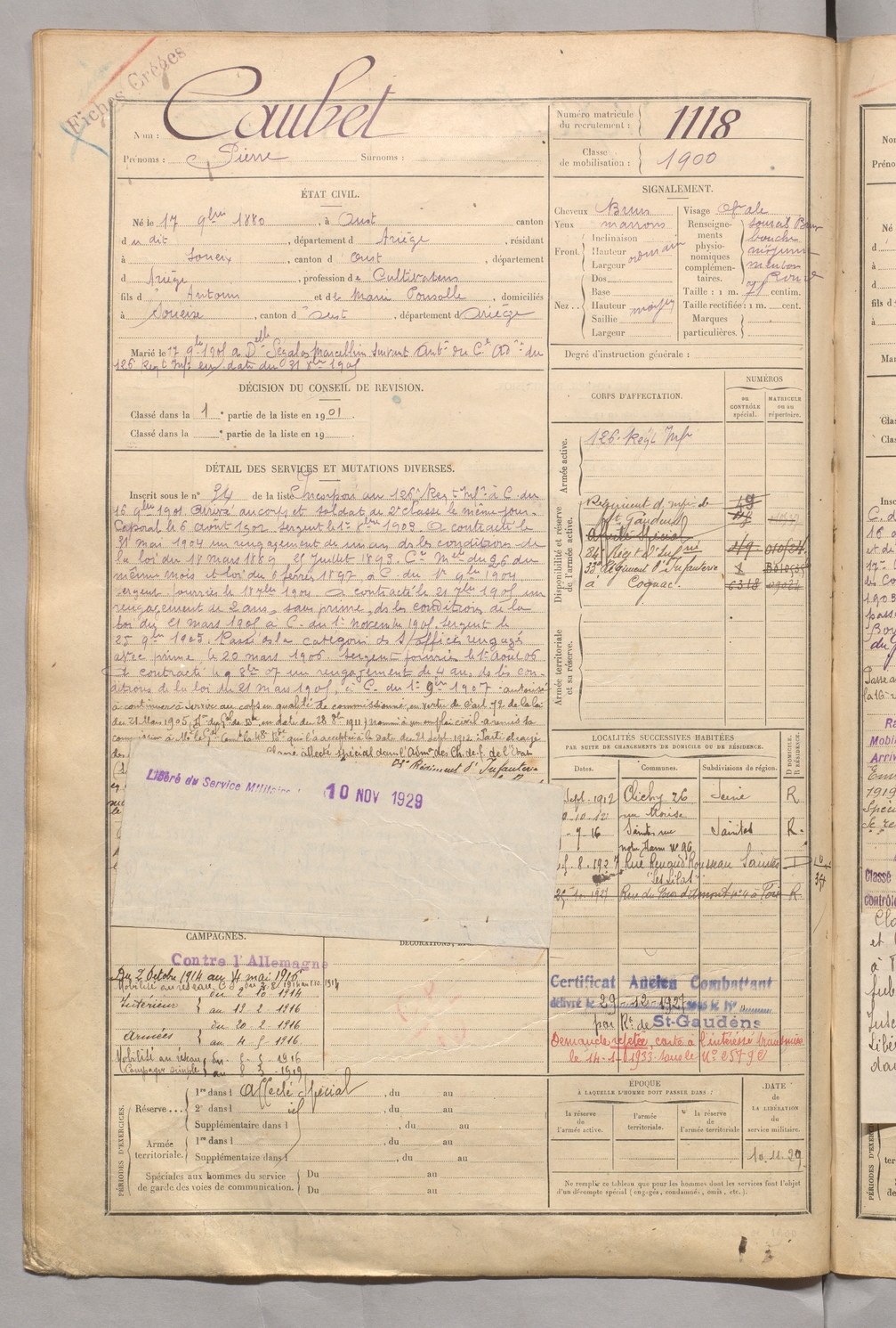| Caubet | Pierre | FOIX | 129 W 5 | 1900 | Oust | Soueix | 1118 |