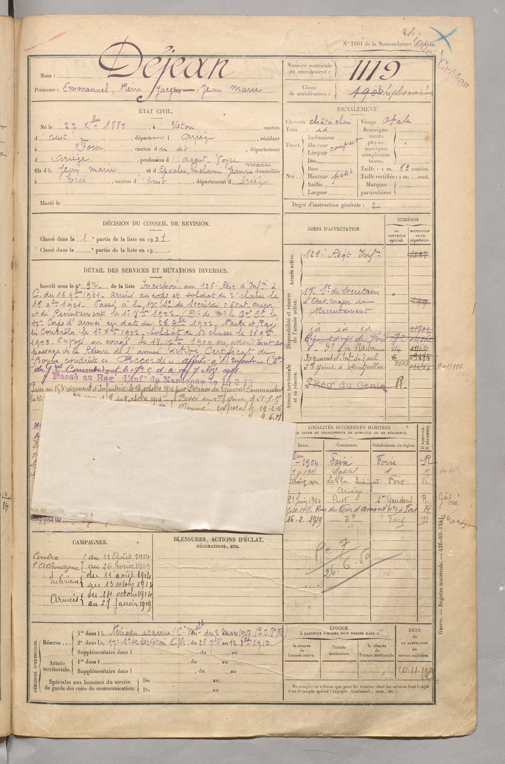 | Déjean | Emmanuel Pierre Jacques Jean Marie | FOIX | 129 W 5 | 1900 | Ustou | Foix | 1119 |