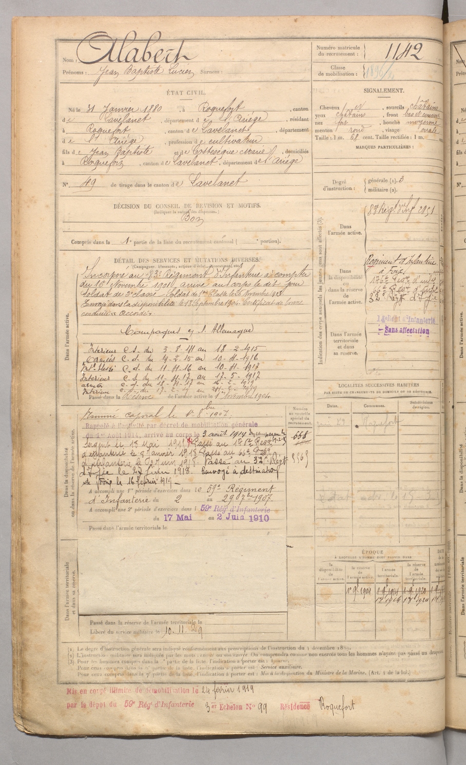 | Alabert | Jean Baptiste Lucien | FOIX | 129 W 4 | 1900 | Roquefort-les-Cascades | Roquefort-les-Cascades | 1142 |
