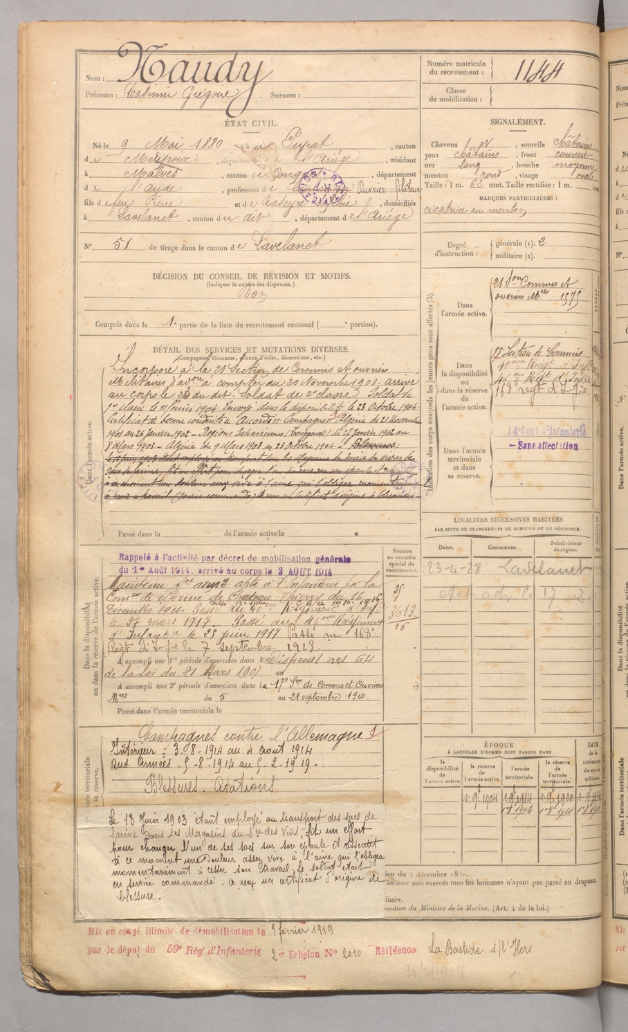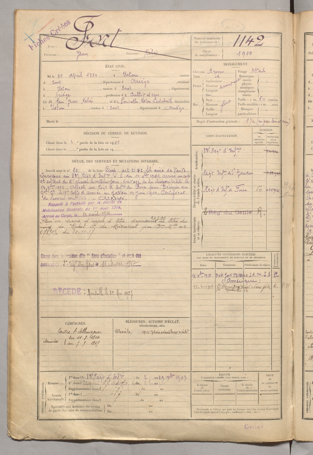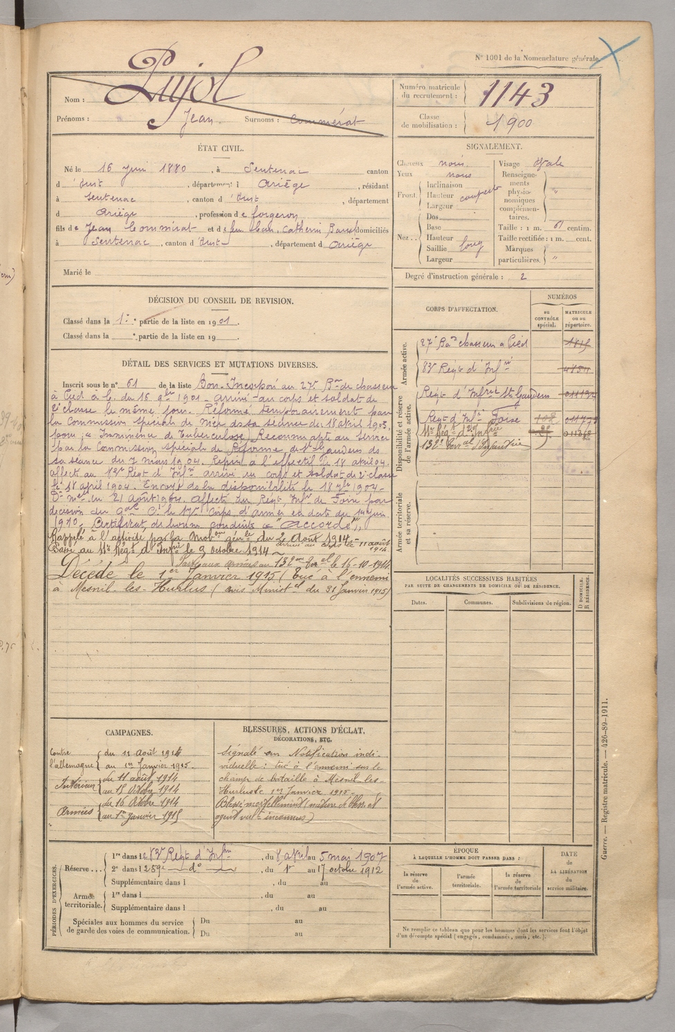 | Pujol | Jean dit Commérat | FOIX | 129 W 5 | 1900 | Sentenac-d'Oust | Sentenac-d'Oust | 1143 |