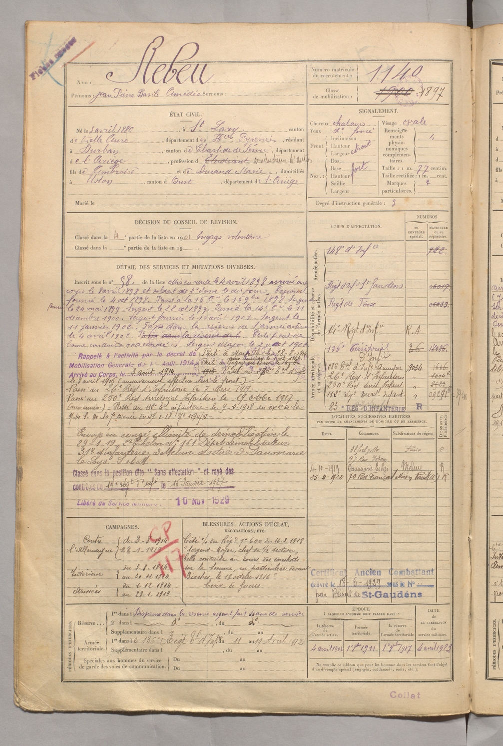 | Rebeu | Jean Pierre Basile Amédée | FOIX | 129 W 5 | 1900 | Saint-Lary | Durban-sur-Arize | 1140 |
