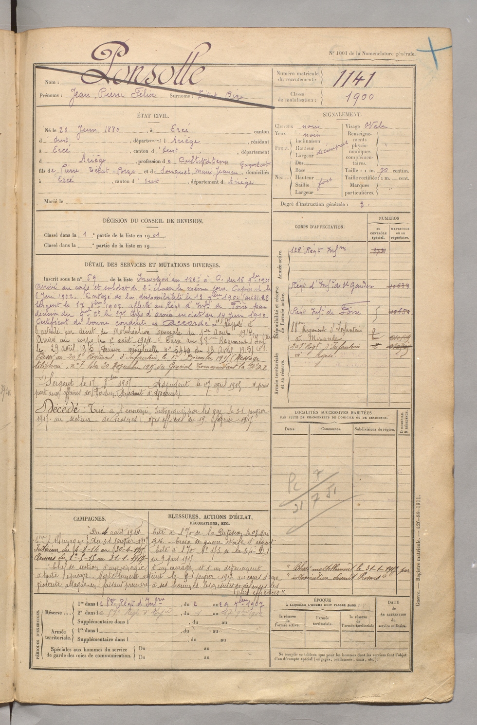 | Ponsolle | Jean Pierre Félix dit ??? Bize | FOIX | 129 W 5 | 1900 | Ercé | Ercé | 1141 |