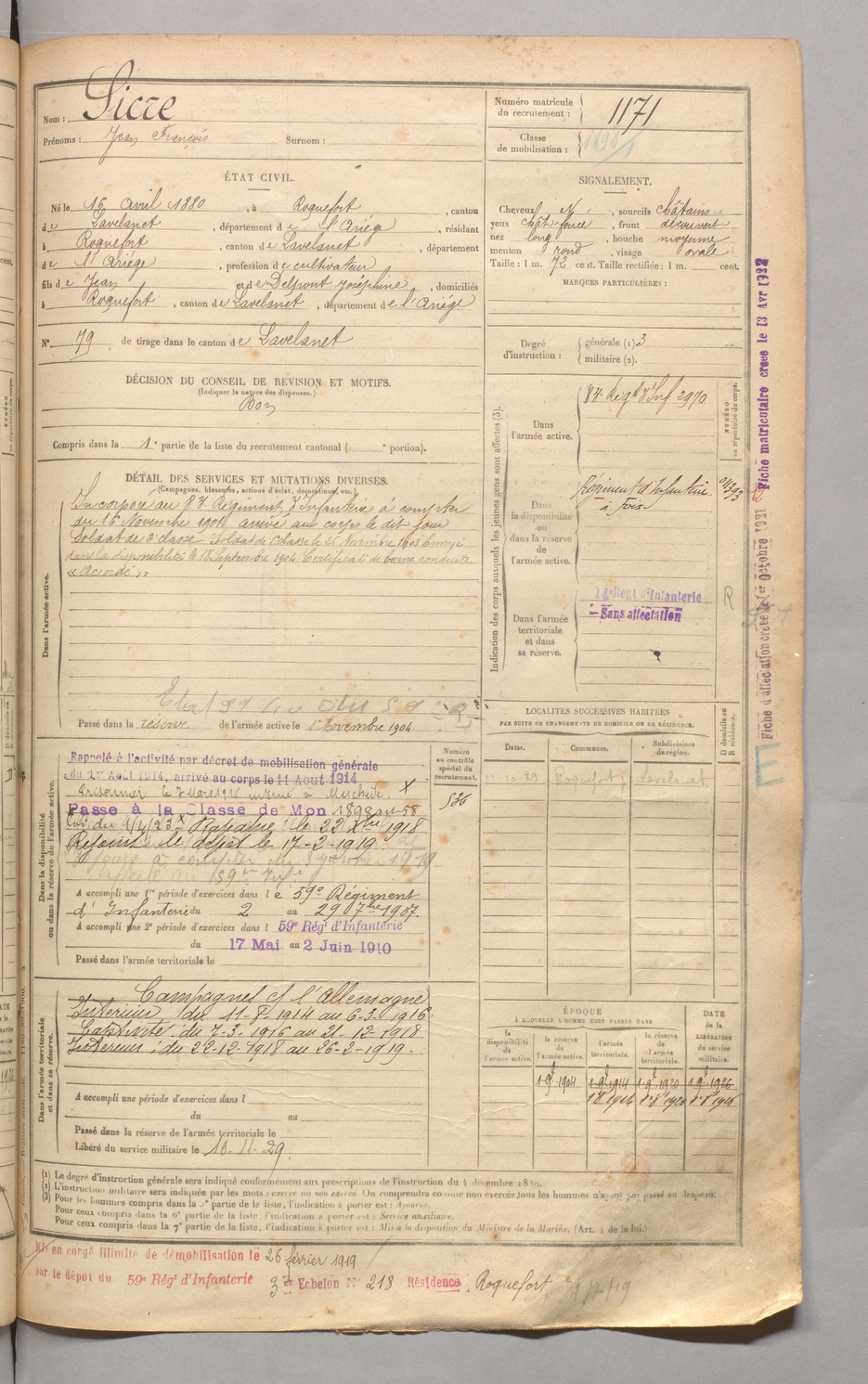 | Sicre | Jean François | FOIX | 129 W 4 | 1900 | Roquefort-les-Cascades | Roquefort-les-Cascades | 1171 |