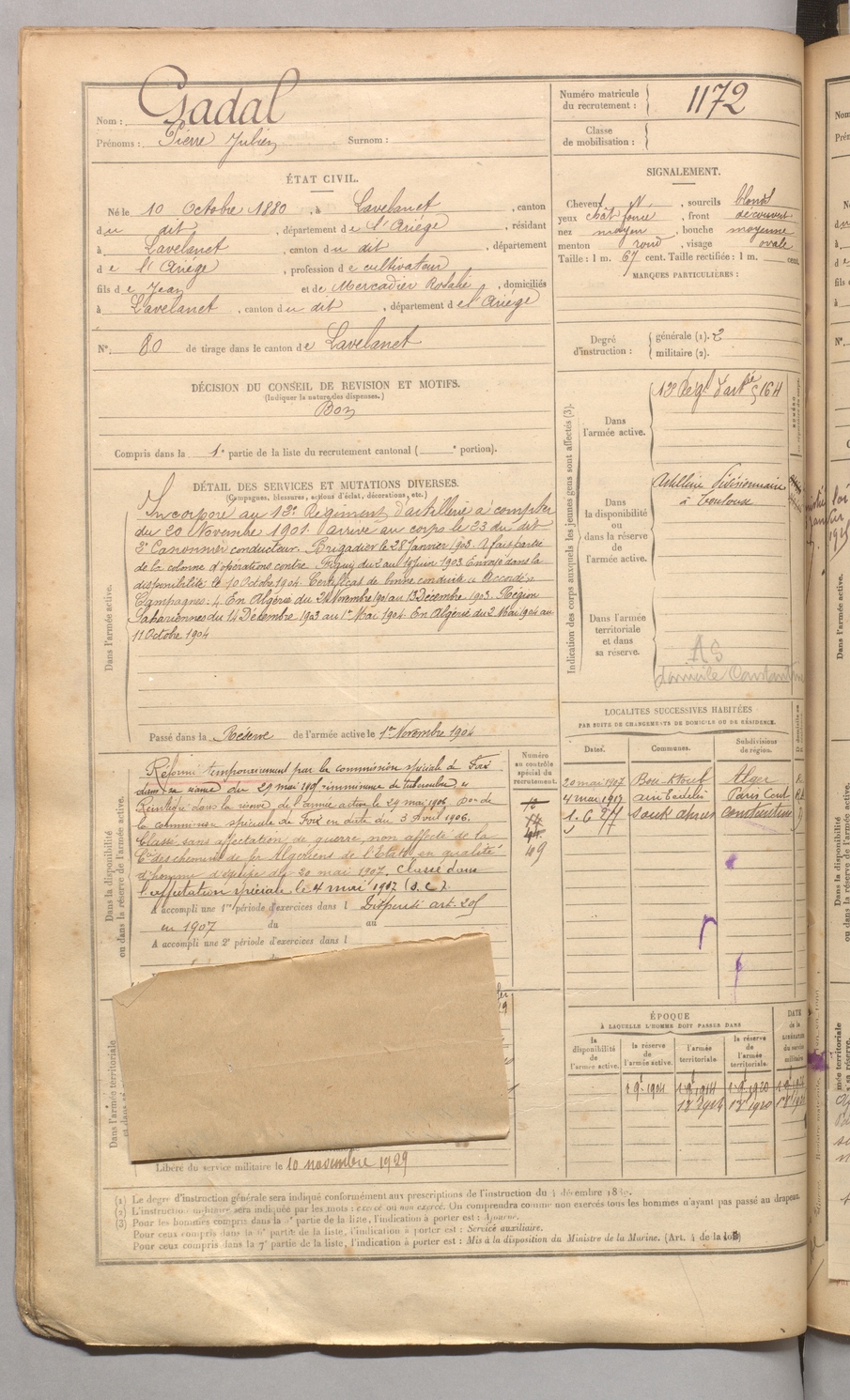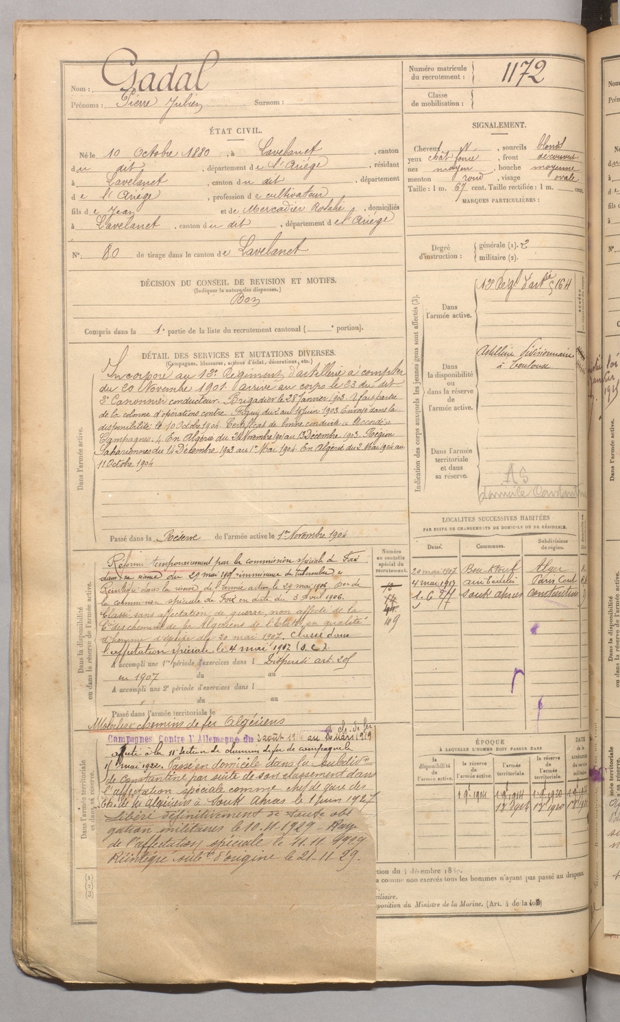 | Gadal | Pierre Julien | FOIX | 129 W 4 | 1900 | Lavelanet | Lavelanet | 1172 |