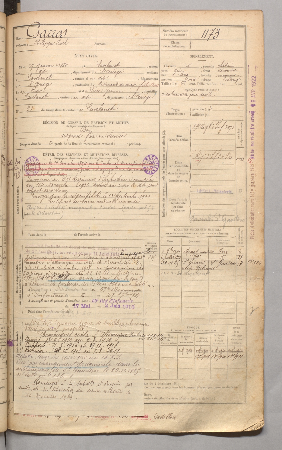 | Garros | Philippe Paul | FOIX | 129 W 4 | 1900 | Lavelanet | Lavelanet | 1173 |