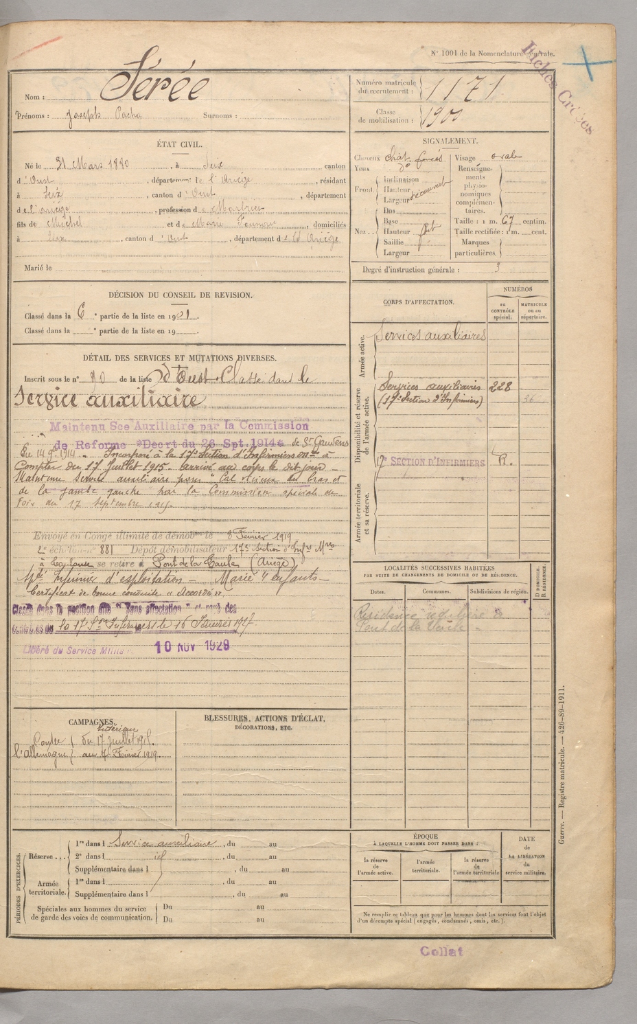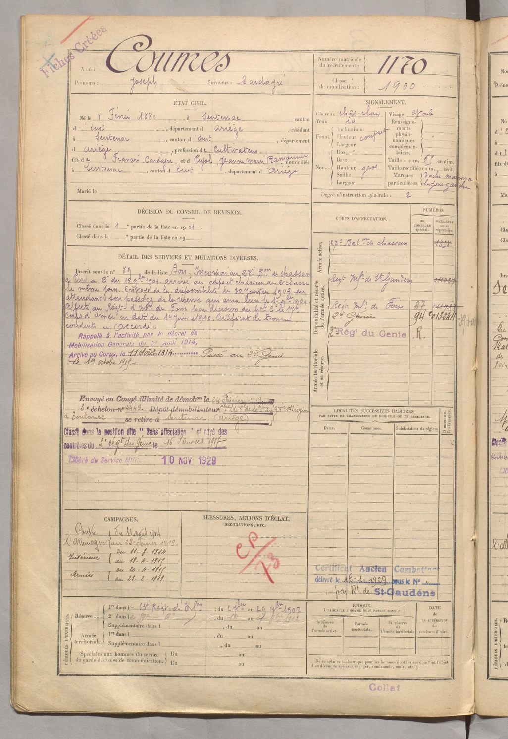 | Coumes | Joseph dit Cardayré | FOIX | 129 W 5 | 1900 | Sentenac-d'Oust | Sentenac-d'Oust | 1170 |