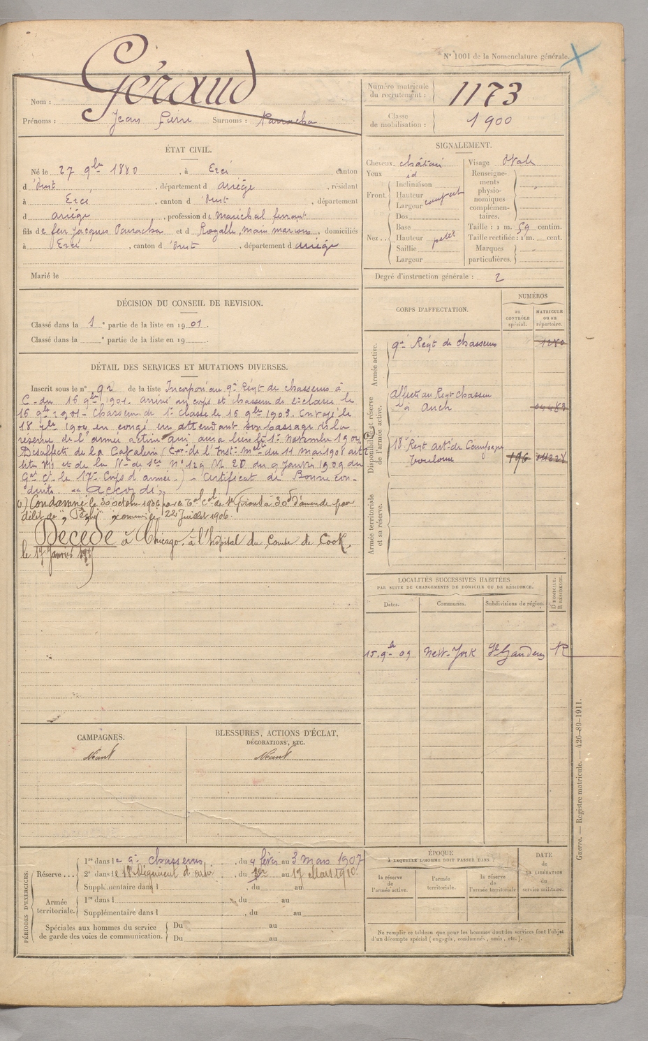 | Géraud | Jean Pierre dit Narracha | FOIX | 129 W 5 | 1900 | Ercé | Ercé | 1173 |