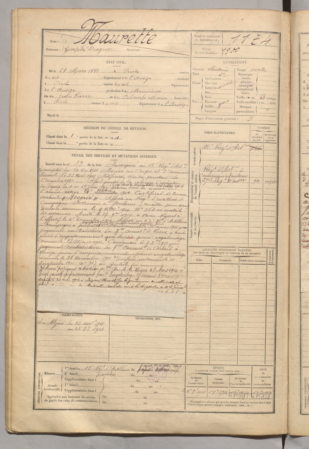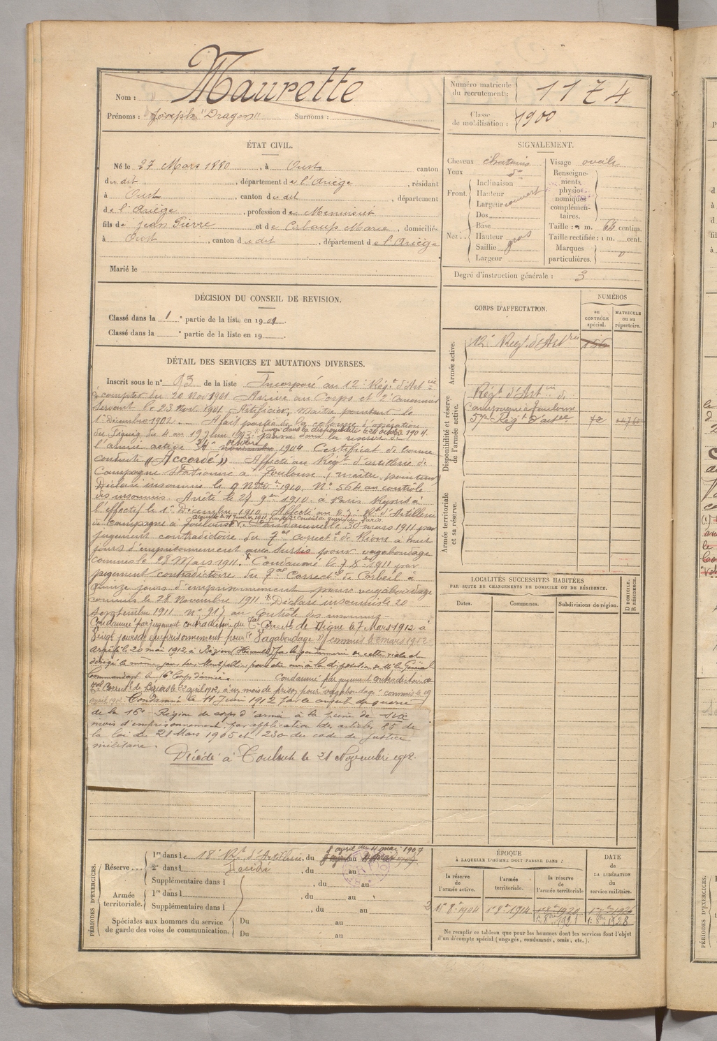 | Maurette | Joseph dit Dragon | FOIX | 129 W 5 | 1900 | Oust | Oust | 1174 |