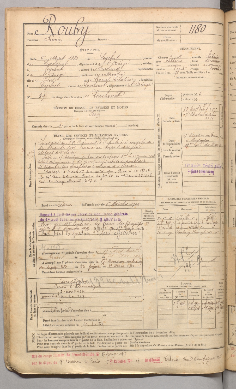 | Rouby | Firmin | FOIX | 129 W 4 | 1900 | Leychert | Leychert | 1180 |