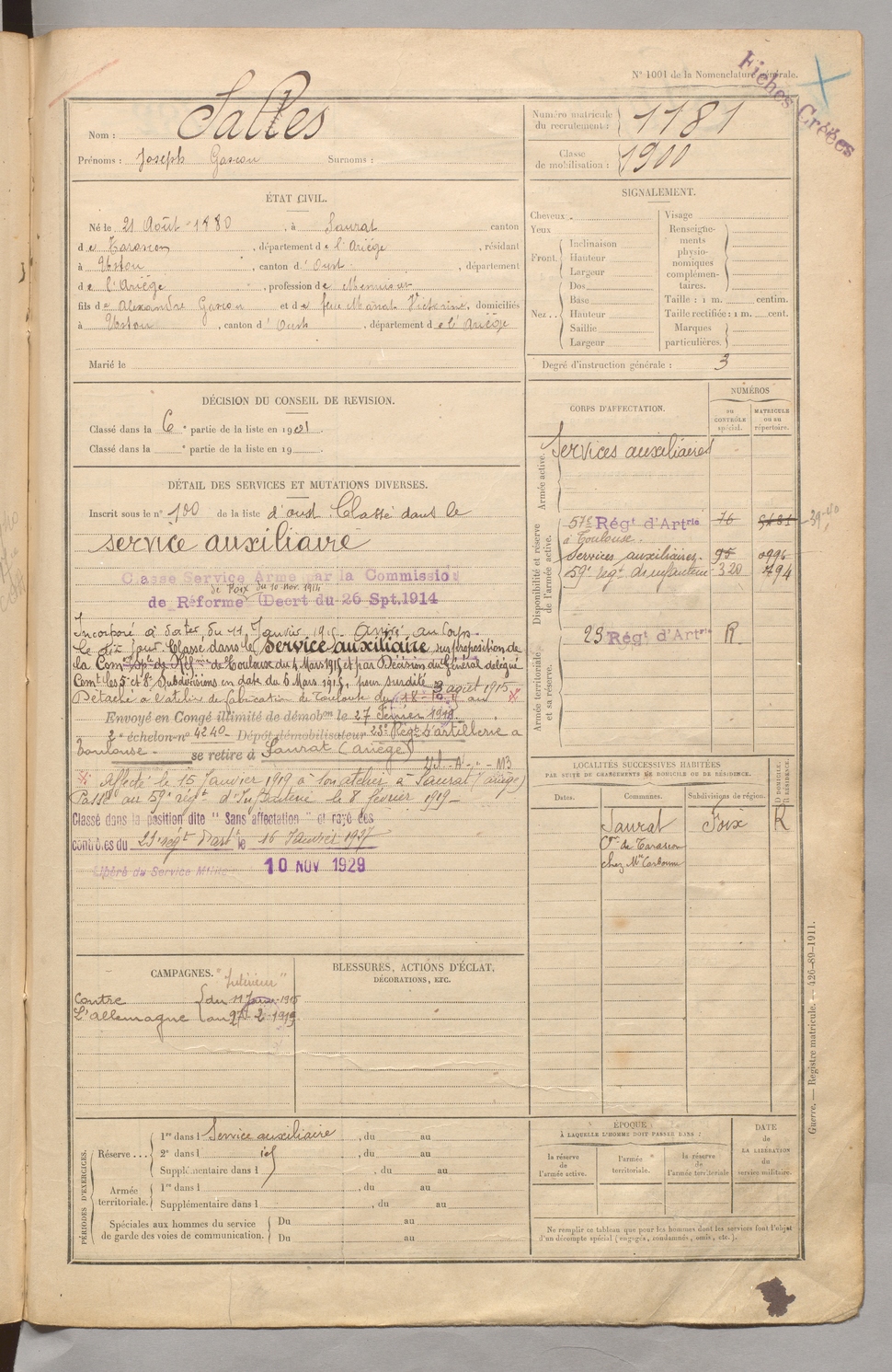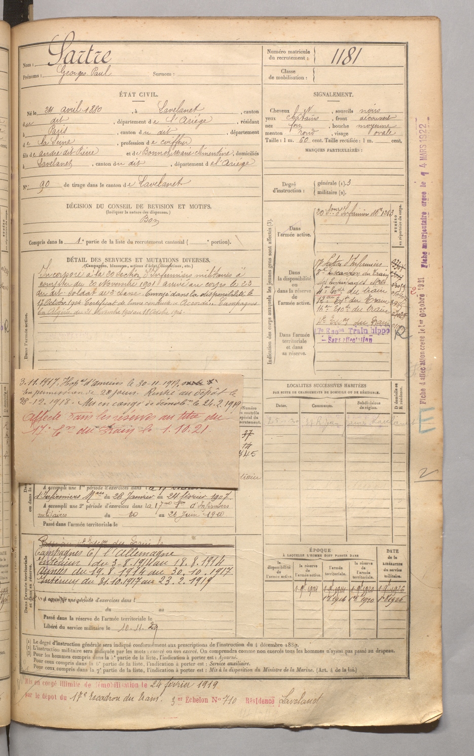 | Sartre | Georges Paul | FOIX | 129 W 4 | 1900 | Lavelanet | Paris | 1181 |