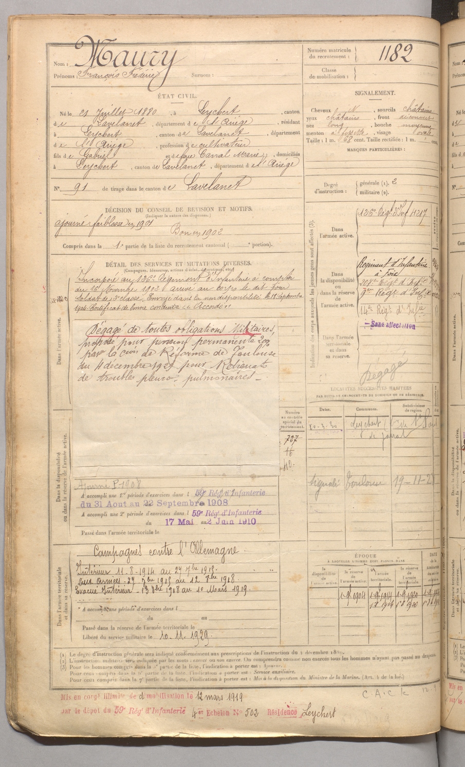 | Maury | François Frédéric | FOIX | 129 W 4 | 1900 | Leychert | Leychert | 1182 |