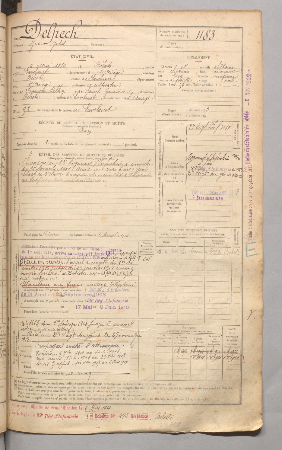 | Delpech | Jean Jules | FOIX | 129 W 4 | 1900 | Bélesta | Bélesta | 1183 |