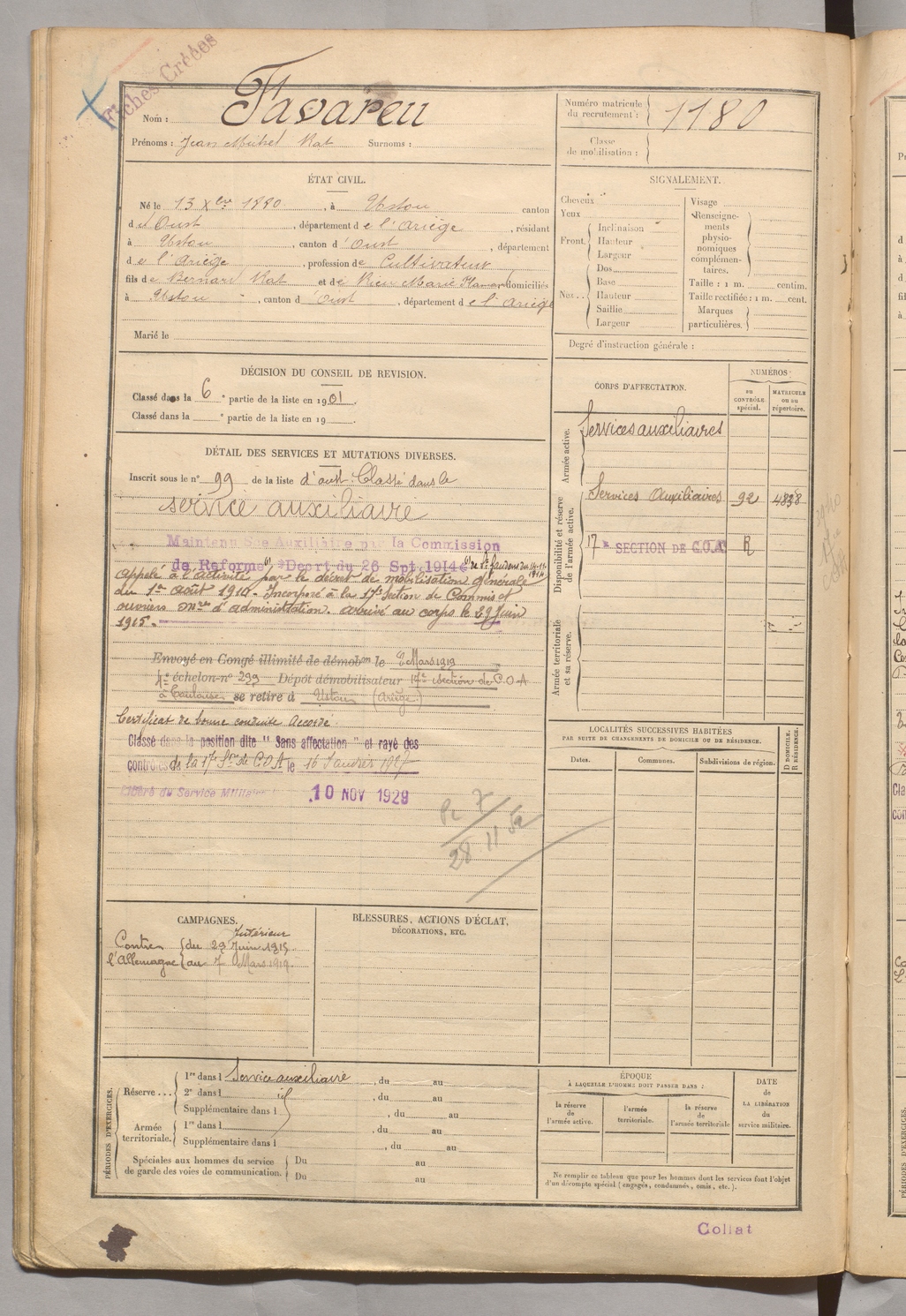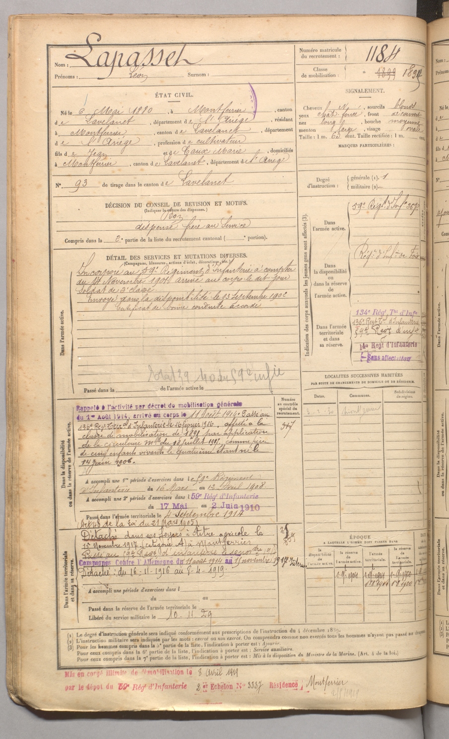 | Lapasset | Léon | FOIX | 129 W 4 | 1900 | Montferrier | Montferrier | 1184 |