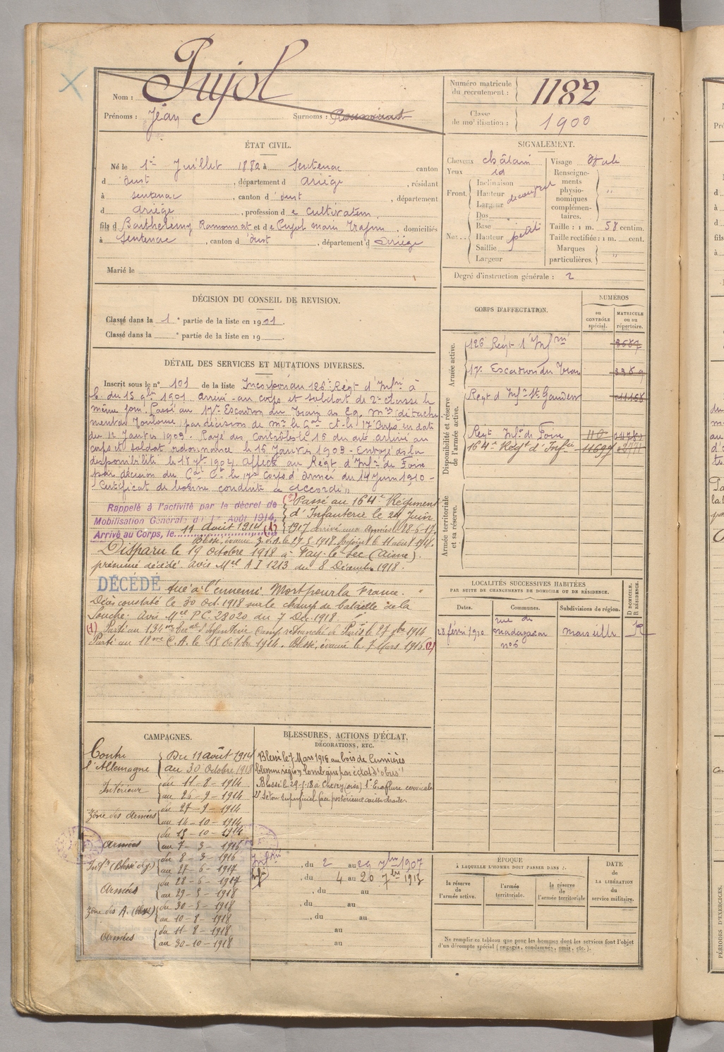 | Pujol | Jean dit ??? | FOIX | 129 W 5 | 1900 | Sentenac-d'Oust | Sentenac-d'Oust | 1182 |