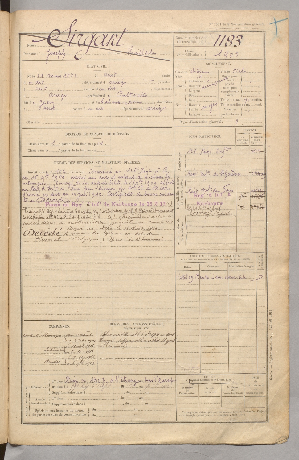 | Sirgant | Joseph dit Haillade | FOIX | 129 W 5 | 1900 | Oust | Oust | 1183 |